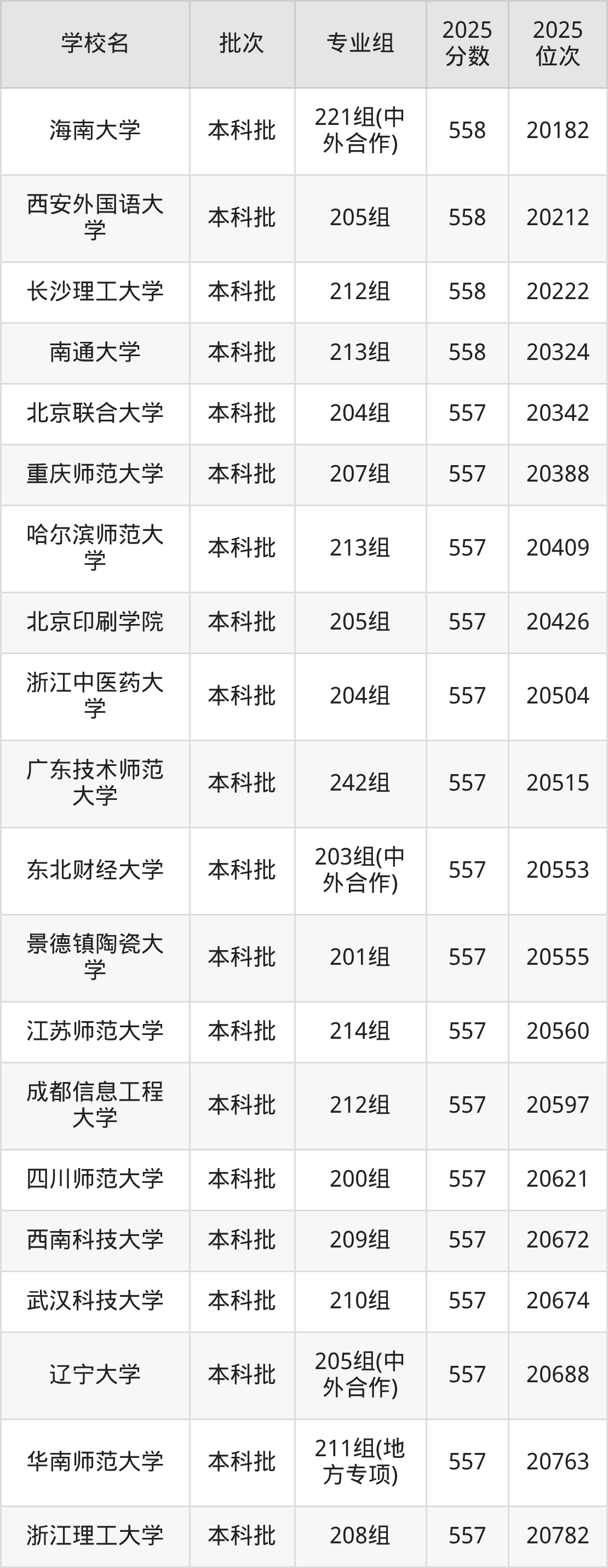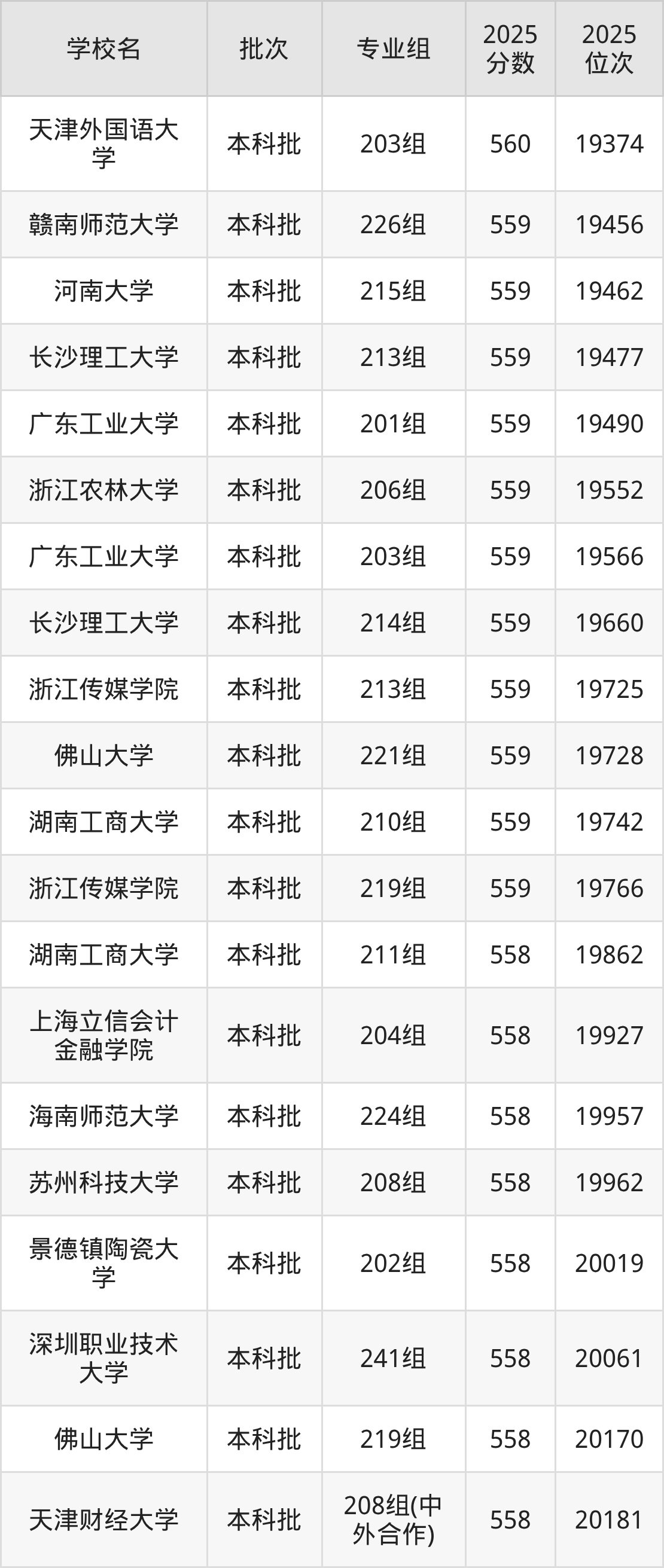 2025年广东高考历史类558分(19859名~20329名)能上的大学有天津财经大学208组(中外合作)、南通大学213组、苏州科技大学208组、景德镇陶瓷大学202组等。