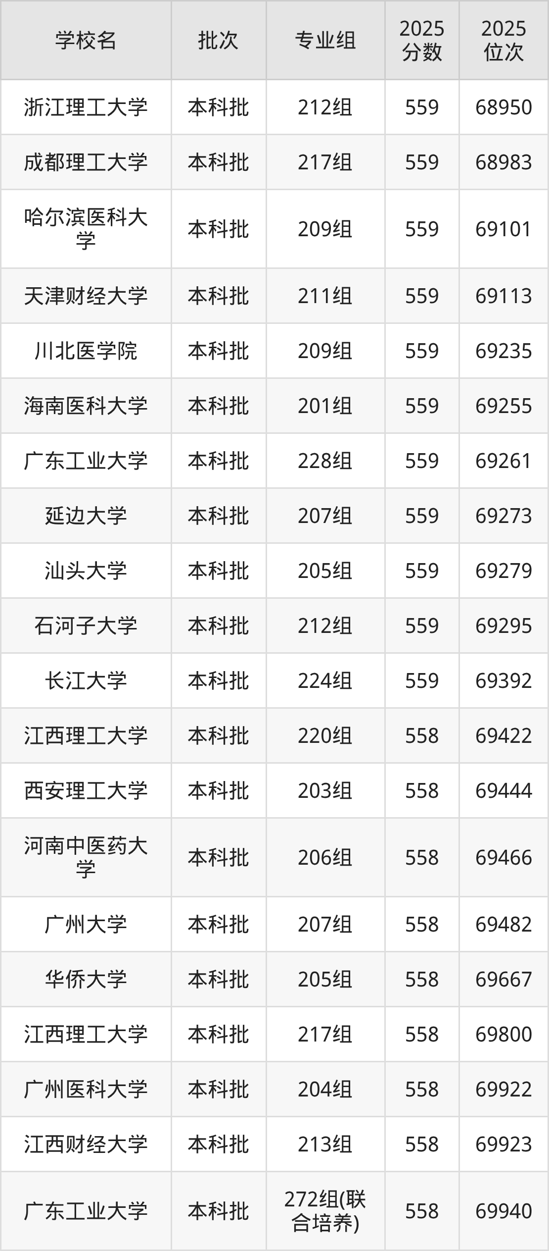 2025年广东高考物理类558分(69413名~70746名)能上的大学有北京工商大学205组、沈阳理工大学206组、东北财经大学209组、东北财经大学210组(中外合作)等。