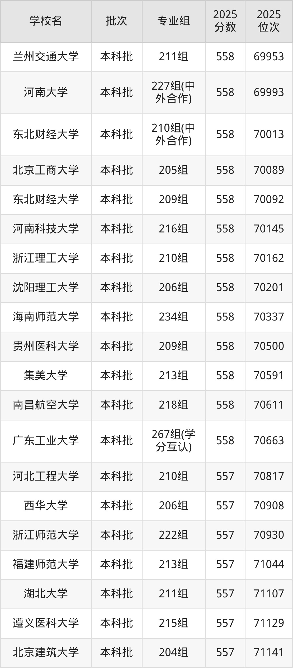 广东高考558分:历史类排名20329位、物理类排名70746位。该分数位次对应能上的大学历史类有天津财经大学208组(中外合作)、南通大学213组;物理类有北京工商大学205组、沈阳理工大学206组,更多名单如下文所示,2026届考生可参考。