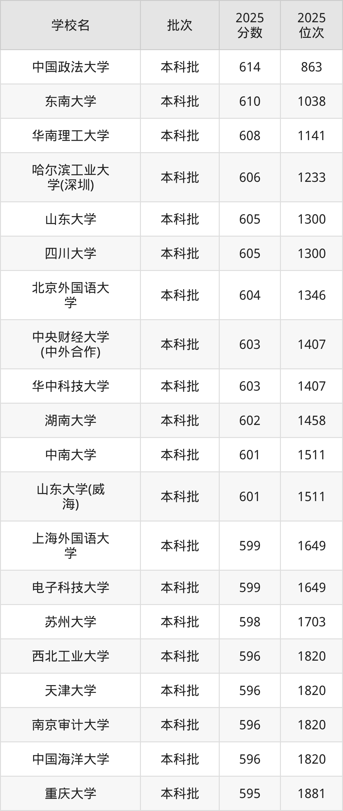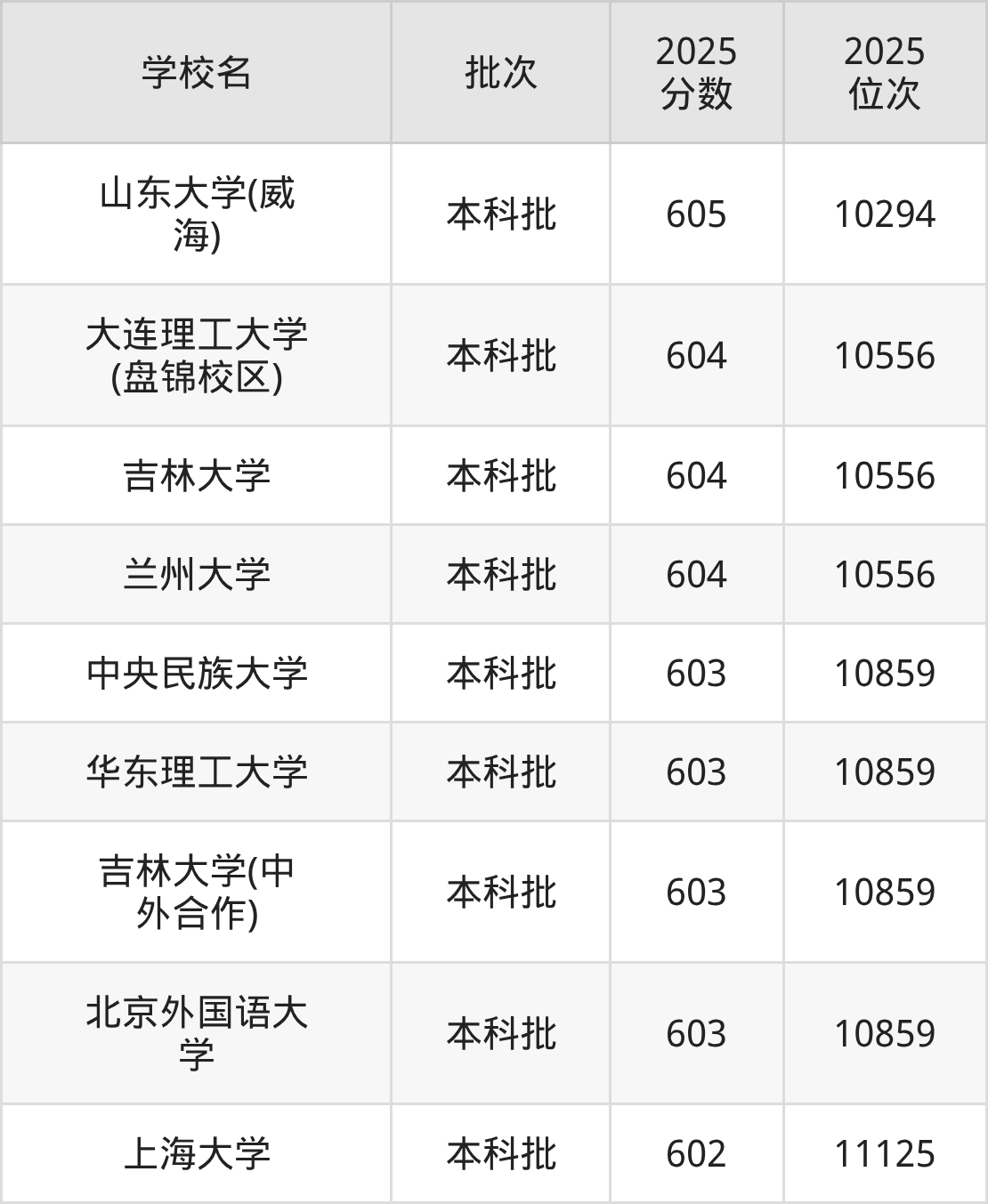 2025年重庆高考物理类603分(10557名~10859名)能上的大学有北京外国语大学、吉林大学(中外合作)、中央民族大学、华东理工大学。