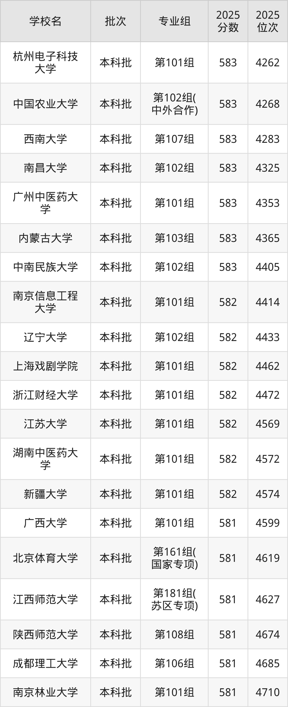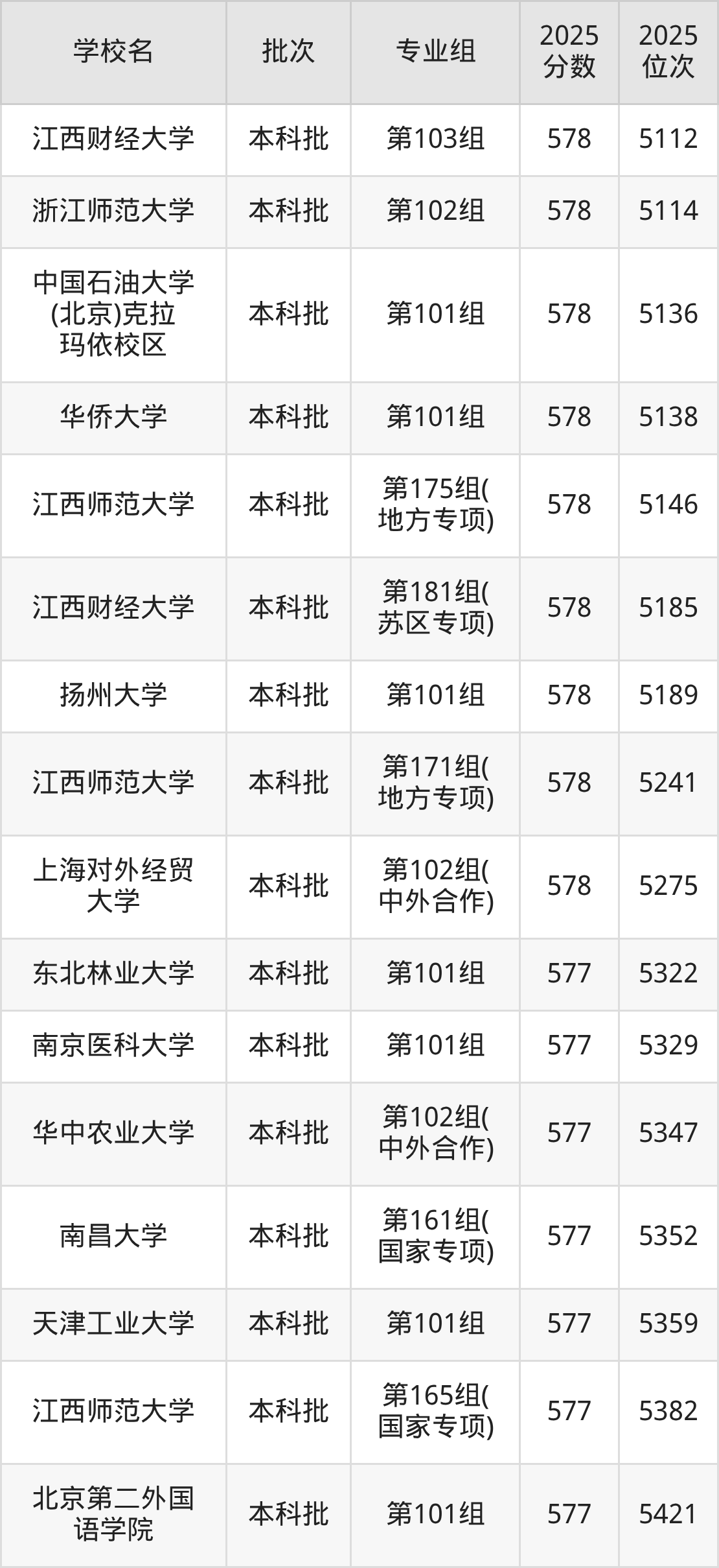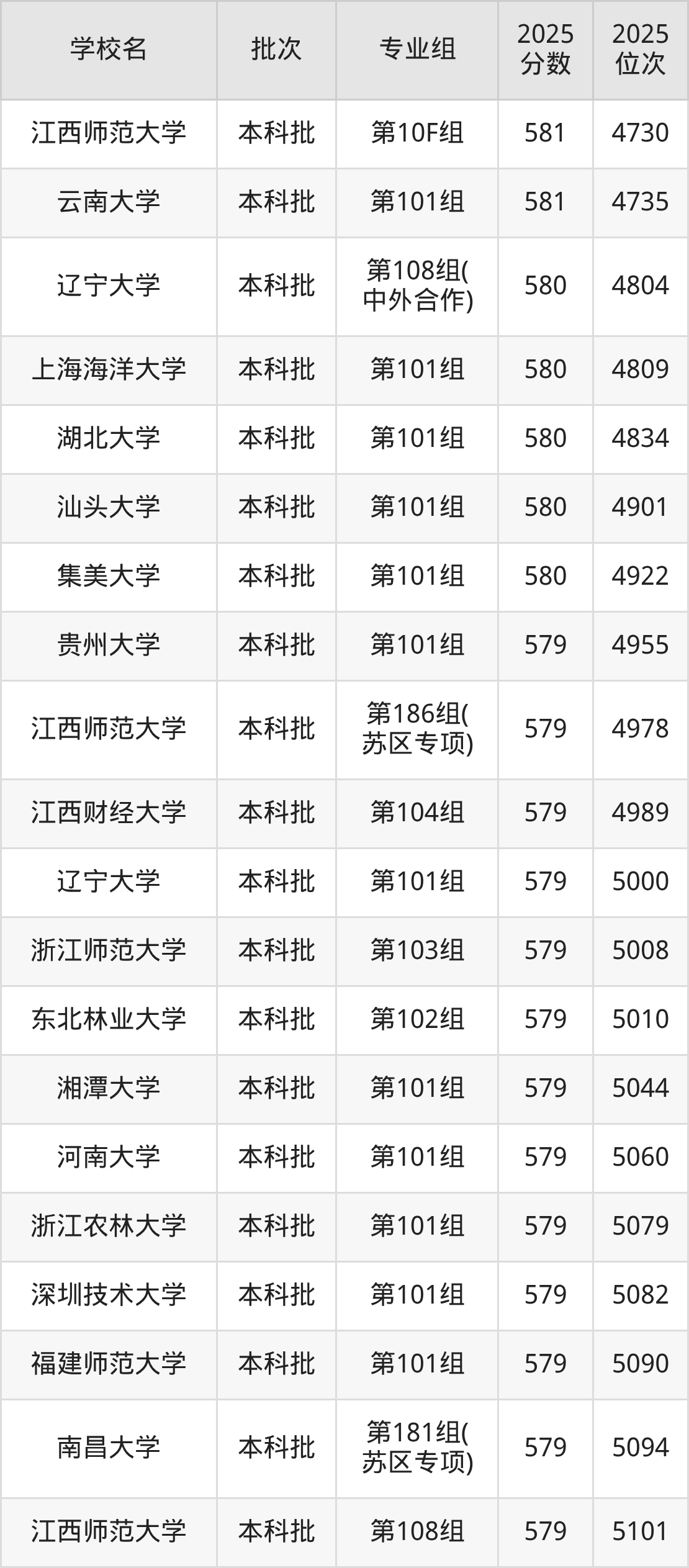 2025年江西高考历史类580分(4757名~4925名)能上的大学有辽宁大学第108组(中外合作)、汕头大学第101组、上海海洋大学第101组、集美大学第101组等。