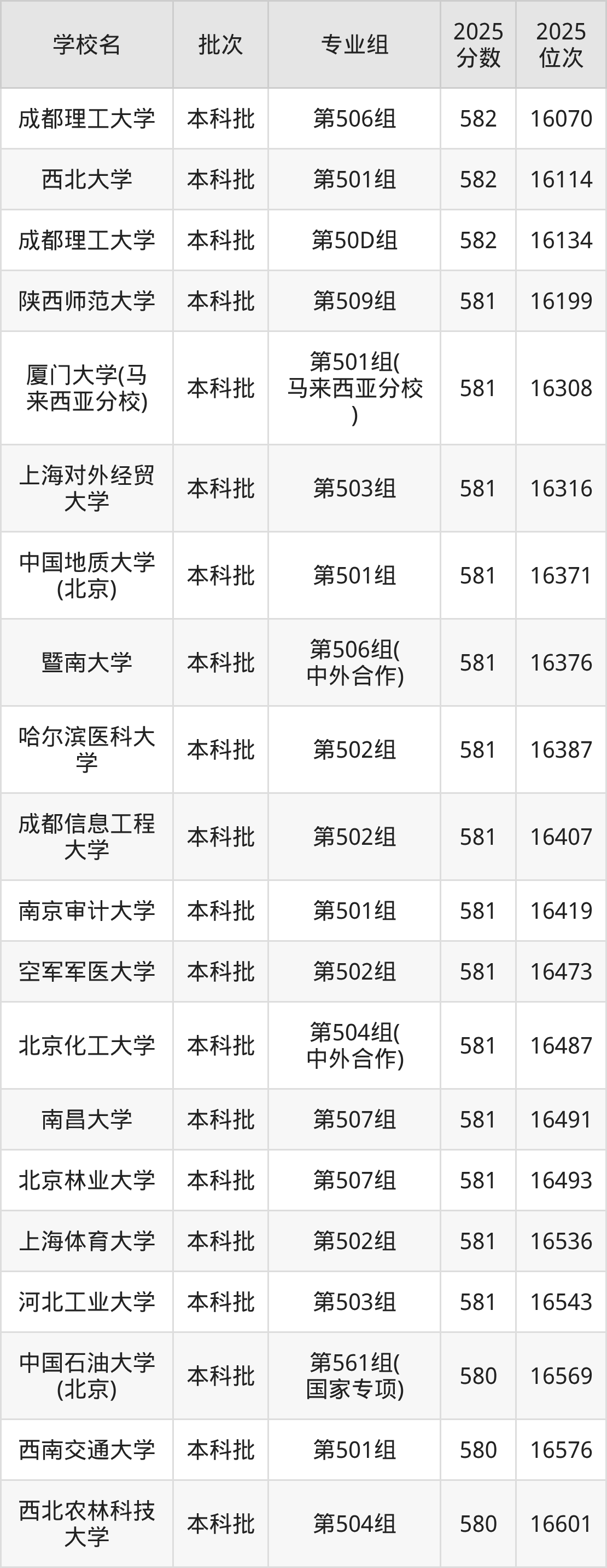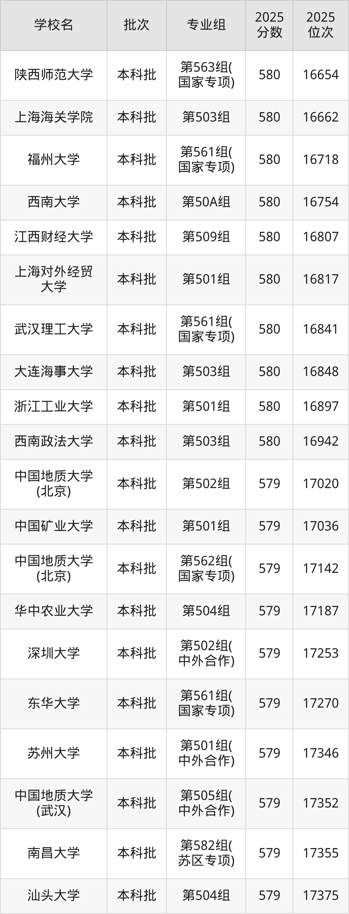2025年江西高考物理类580分(16546名~16993名)能上的大学有大连海事大学第503组、上海海关学院第503组、西南大学第50A组、陕西师范大学第563组(国家专项)等。