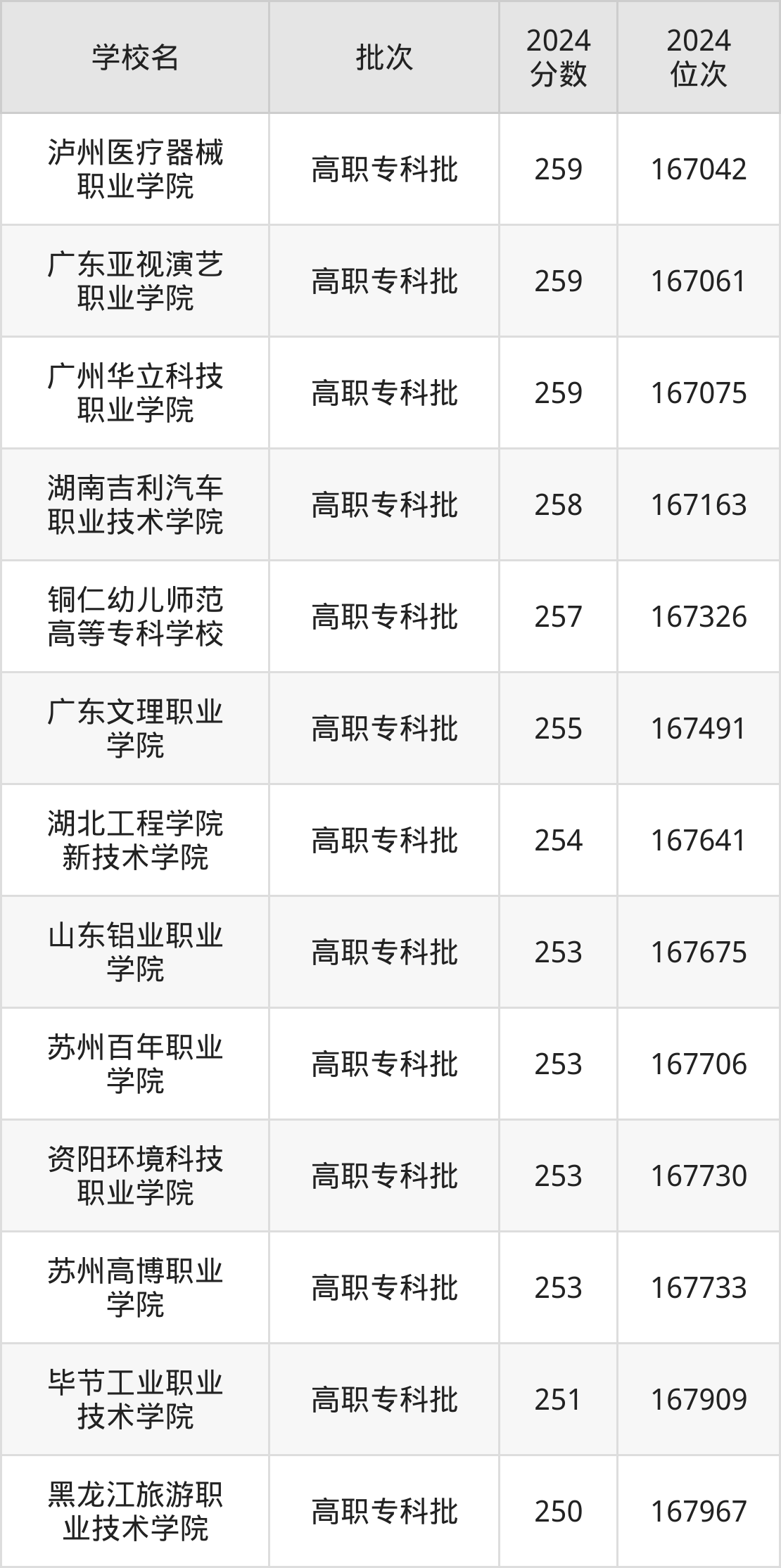 2024年陕西高考理科256分(167381名~167476名)录取位次低于该区间(较稳妥)的有广东文理职业学院(167491名)、湖北工程学院新技术学院(167641名)等;录取位次高于该区间(可冲)的有铜仁幼儿师范高等专科学校(167326名)、湖南吉利汽车职业技术学院(167163名)等。