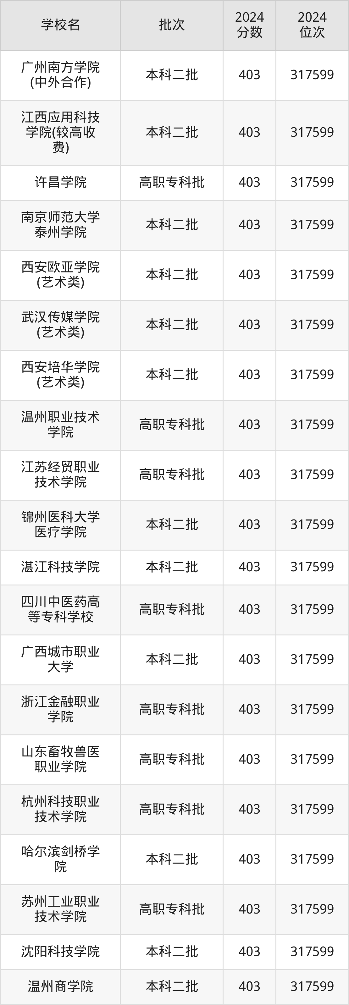 河南高考403分:文科排名122317位、理科排名317600位。该分数位次对应能上的大学文科有上海电子信息职业技术学院、镇江市高等专科学校;理科有许昌学院、南京师范大学泰州学院,更多名单如下文所示,2025届考生可参考。