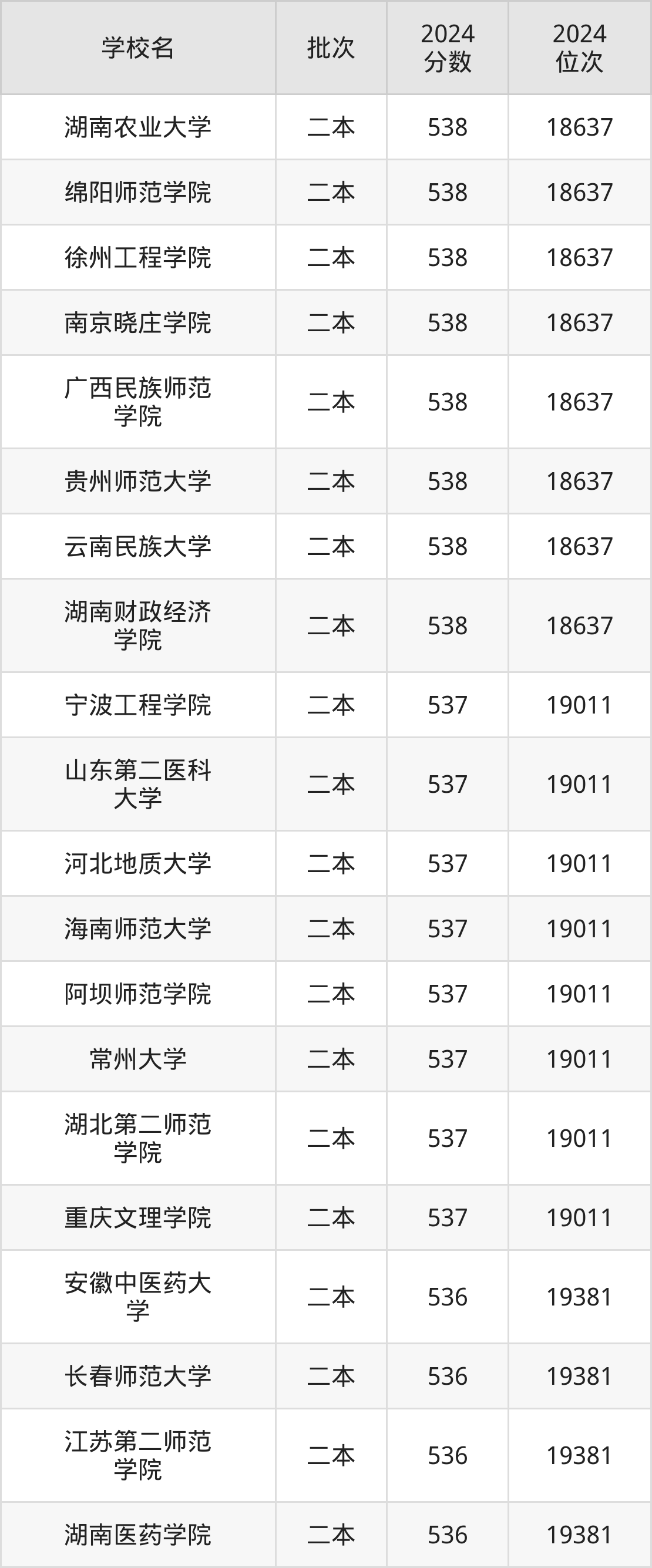 2024年云南高考文科536分(19012名~19381名)能上的大学有江苏第二师范学院、湖南医药学院、广西科技大学、安徽中医药大学等。