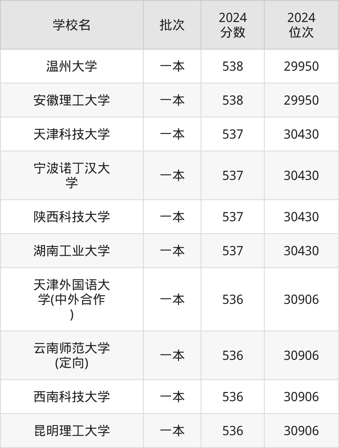 2024年云南高考理科536分(30431名~30906名)能上的大学有天津外国语大学(中外合作)、云南师范大学(定向)、西南科技大学、昆明理工大学。