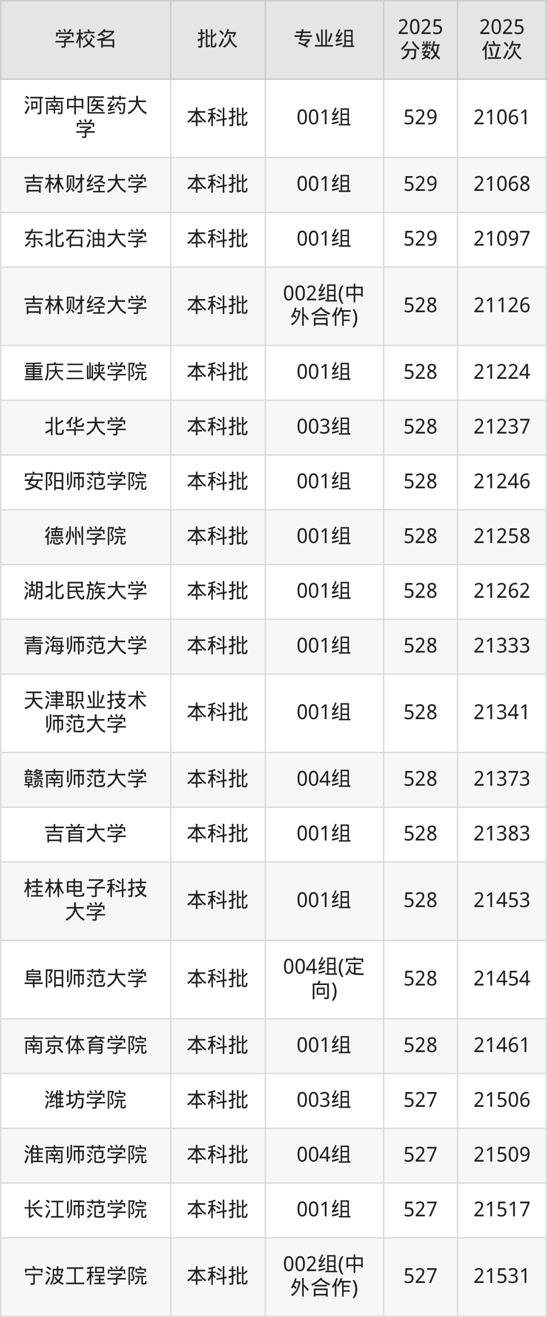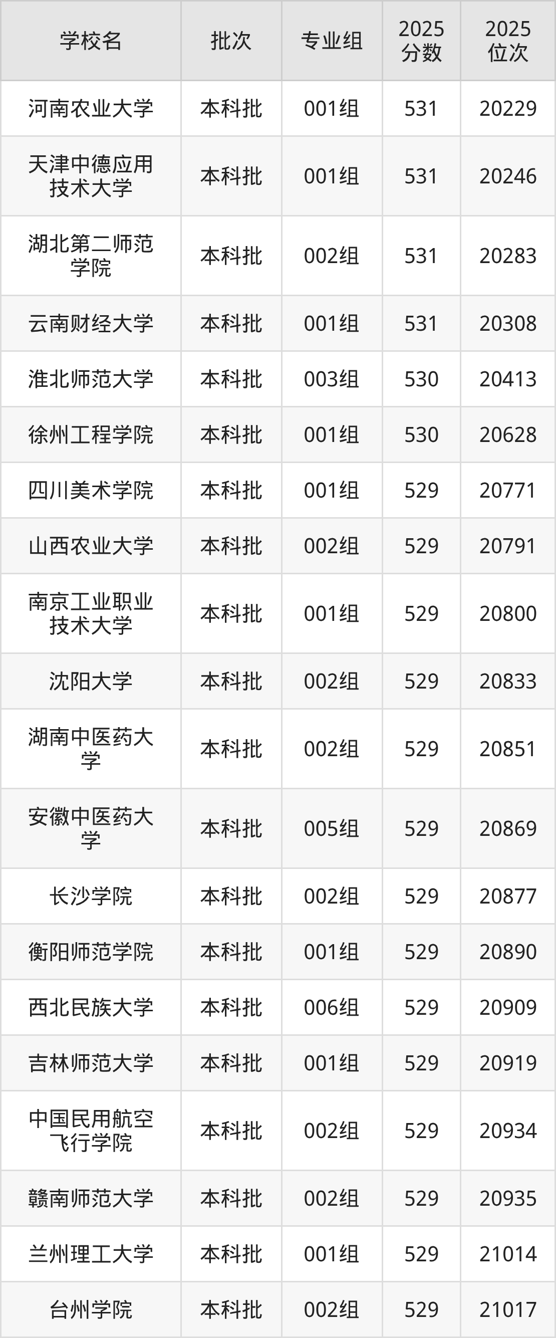 2025年安徽高考历史类529分(20730名~21104名)能上的大学有长沙学院002组、东北石油大学001组、赣南师范大学002组、河南中医药大学001组等。
