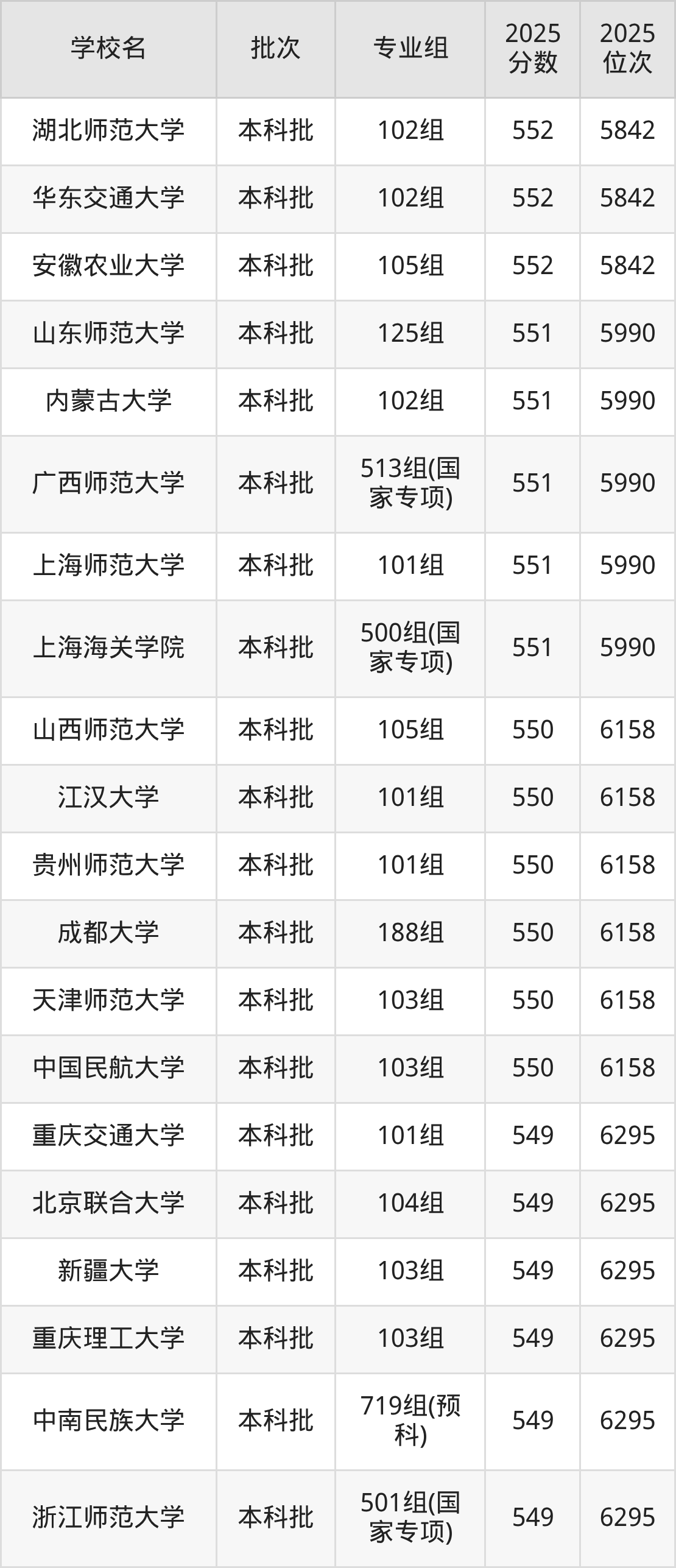2025年广西高考历史类550分(5991名~6158名)能上的大学有中国民航大学103组、天津师范大学103组、山西师范大学105组、贵州师范大学101组等。