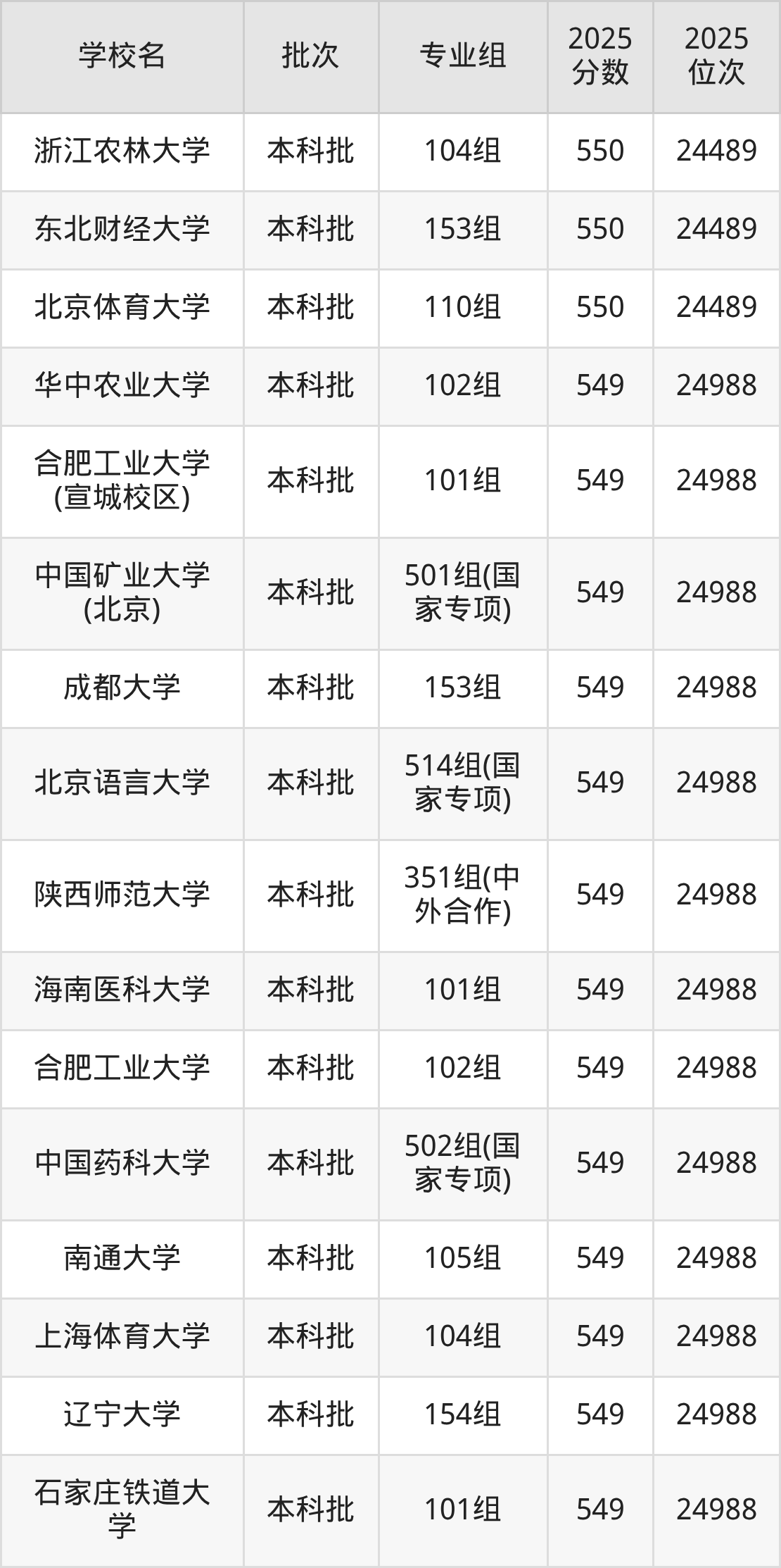 2025年广西高考物理类550分(23957名~24489名)能上的大学有北京体育大学110组、东北财经大学153组、浙江农林大学104组、杭州师范大学103组等。