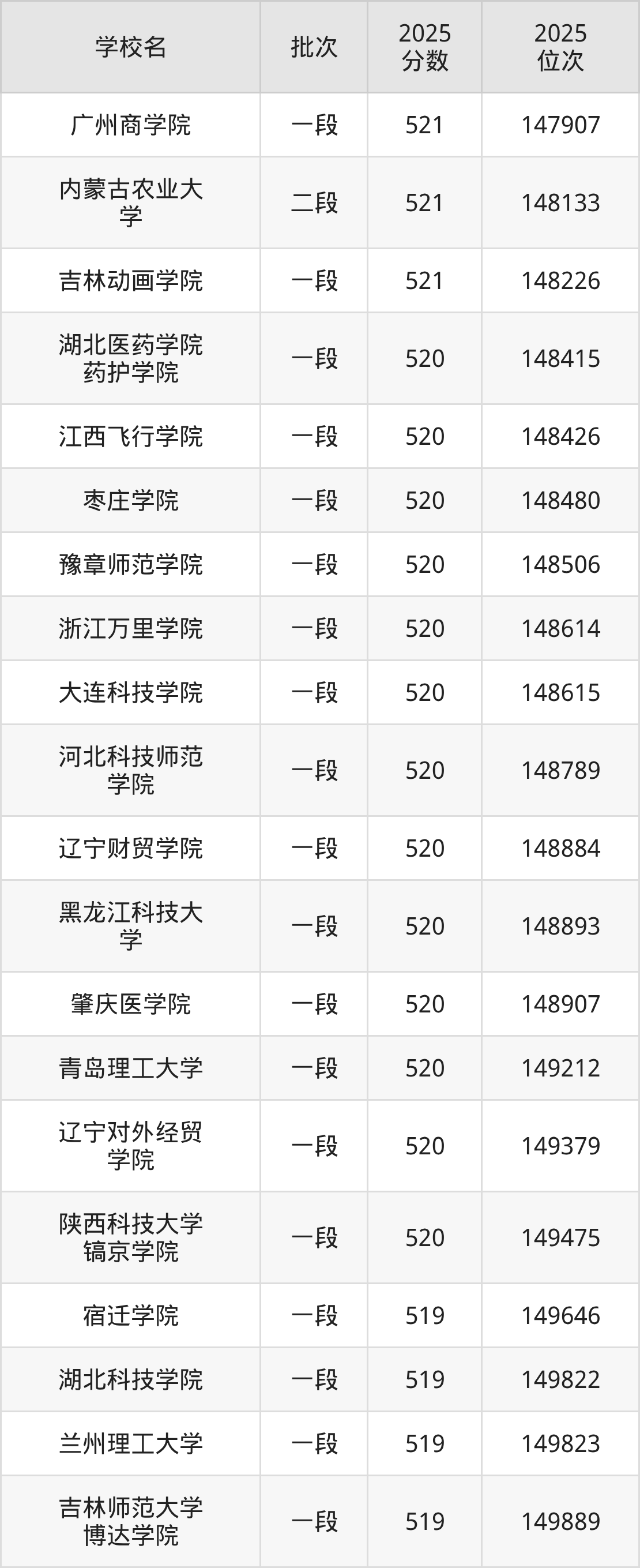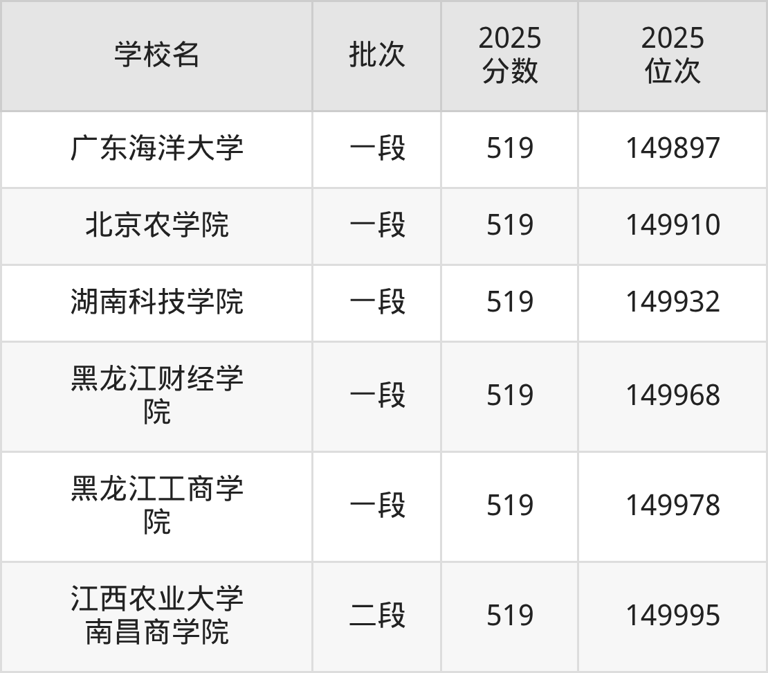 另外录取位次低于该区间(较稳妥)的有宿迁学院(149646名)、湖北科技学院(149822名)等;录取位次高于该区间(可冲)的有吉林动画学院(148226名)、内蒙古农业大学(148133名)等。