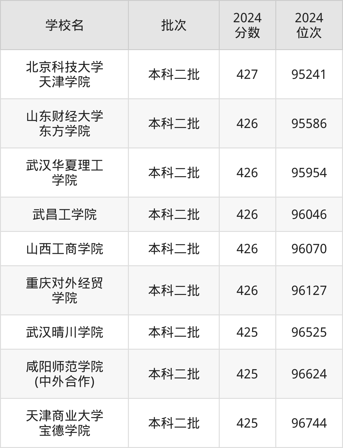 陕西高考426分:文科排名36359位、理科排名96291位。该分数位次对应能上的大学文科有青岛城市学院、西安欧亚学院;理科有山西工商学院、山东财经大学东方学院,更多名单如下文所示,2025届考生可参考。