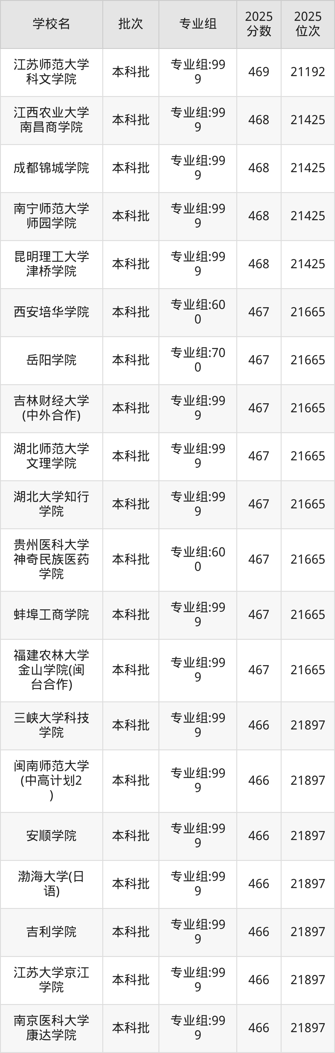 2025年福建高考历史类467分(21426名~21665名)能上的大学有福建农林大学金山学院(闽台合作)专业组:999、蚌埠工商学院专业组:999、贵州医科大学神奇民族医药学院专业组:600、湖北大学知行学院专业组:999等。
