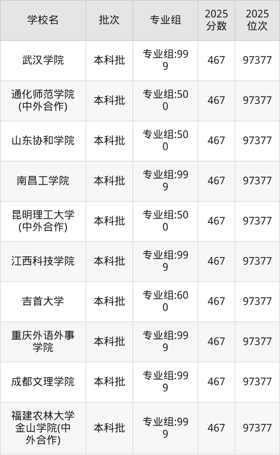 2025年福建高考物理类467分(96447名~97377名)能上的大学有福建农林大学金山学院(中外合作)专业组:999、成都文理学院专业组:999、重庆外语外事学院专业组:999、吉首大学专业组:600等。