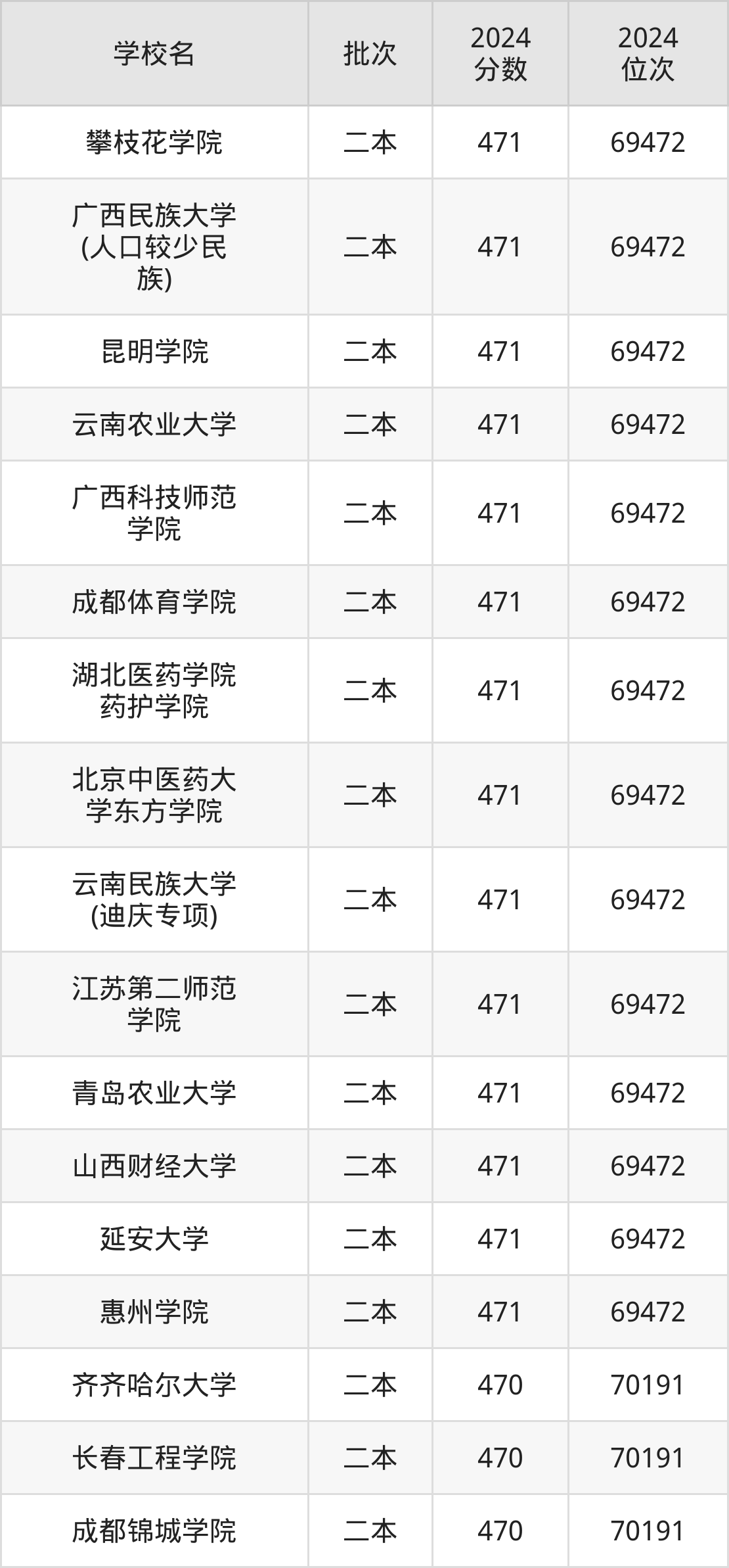 2024年云南高考理科470分(69473名~70191名)能上的大学有成都锦城学院、长春工程学院、齐齐哈尔大学。