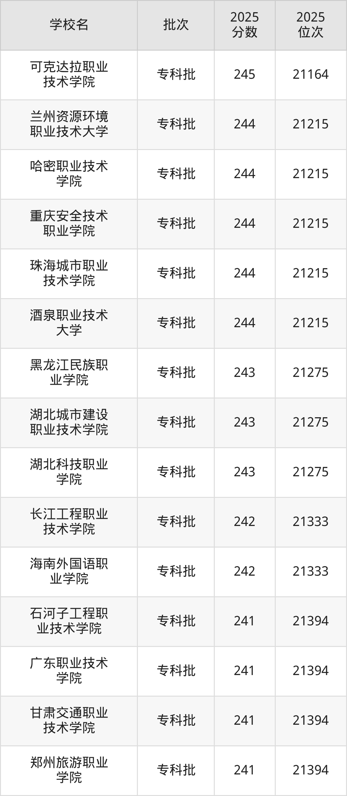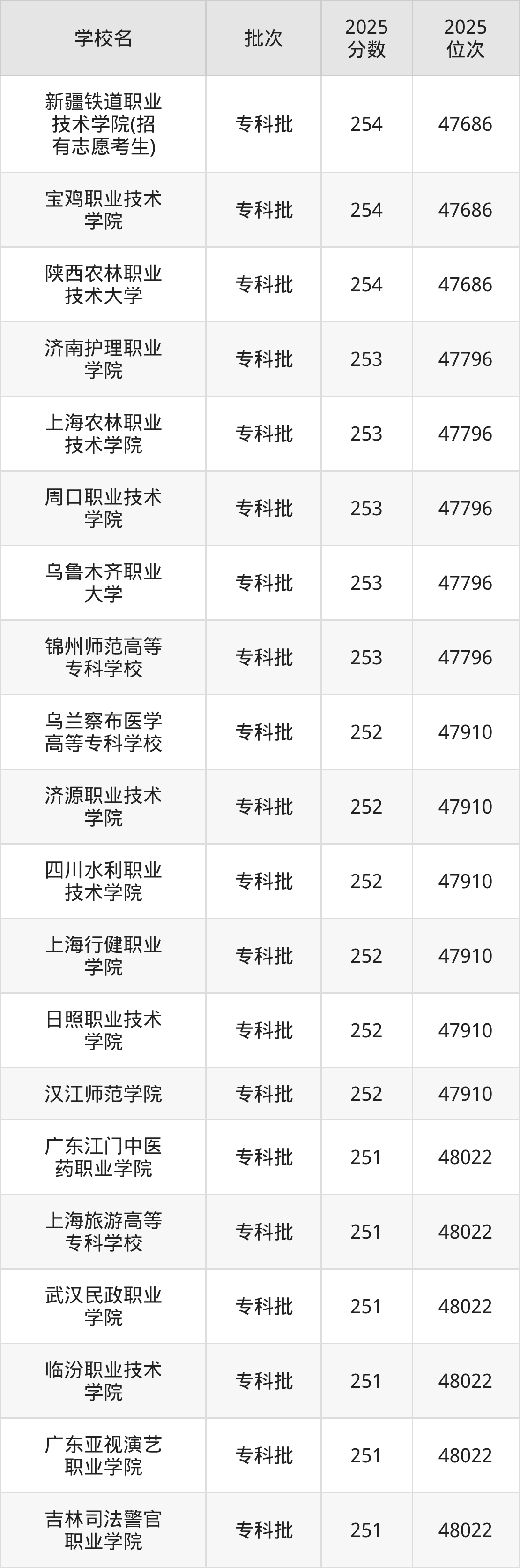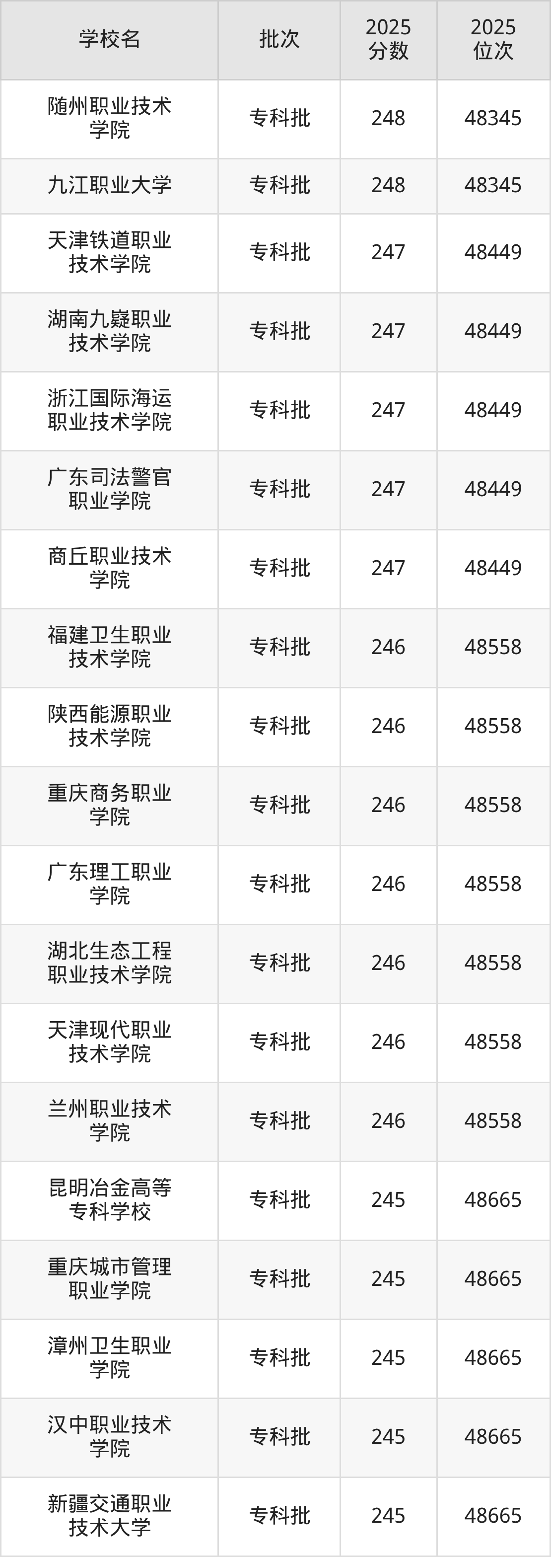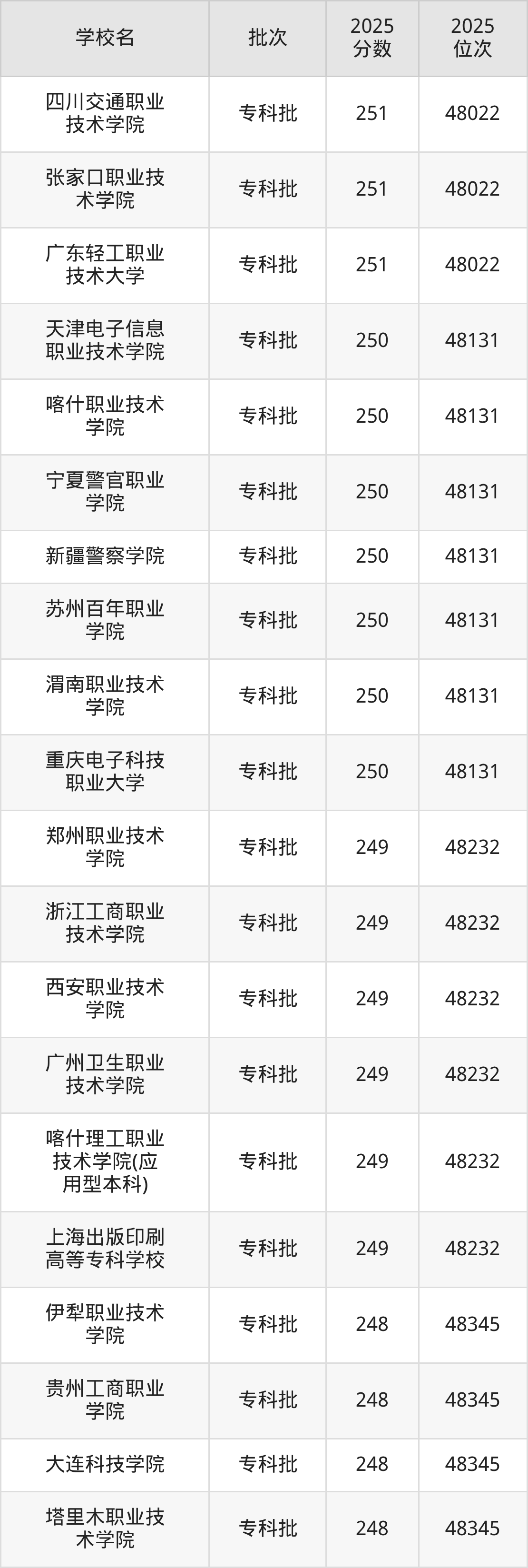 2025年新疆高考理科249分(48132名~48232名)能上的大学有上海出版印刷高等专科学校、浙江工商职业技术学院、郑州职业技术学院、西安职业技术学院等。