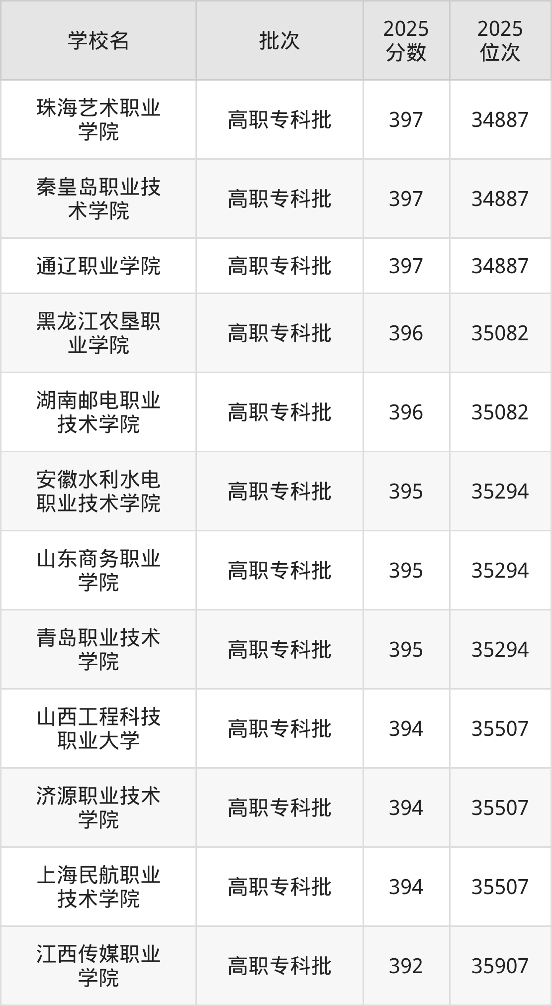 2025年辽宁高考历史类394分(35295名~35507名)能上的大学有上海民航职业技术学院、济源职业技术学院、山西工程科技职业大学。