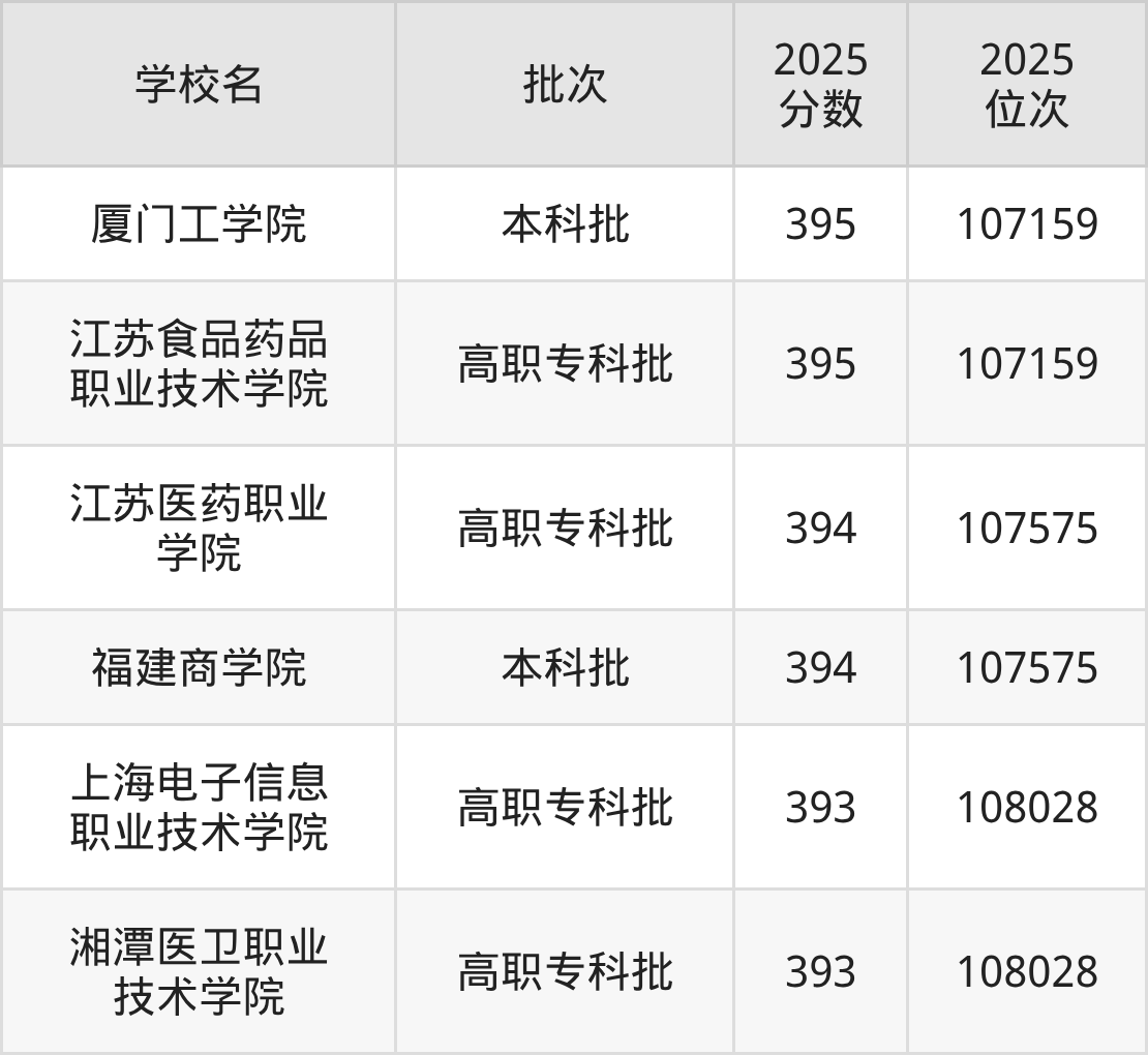 2025年辽宁高考物理类394分(107160名~107575名)能上的大学有江苏医药职业学院、福建商学院。