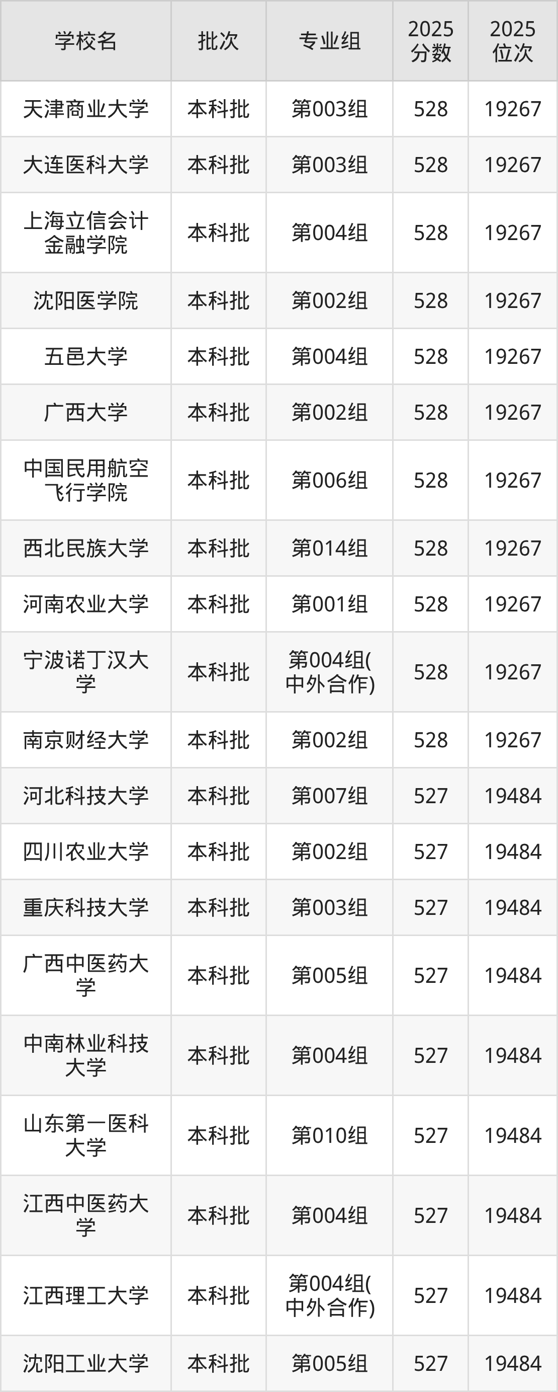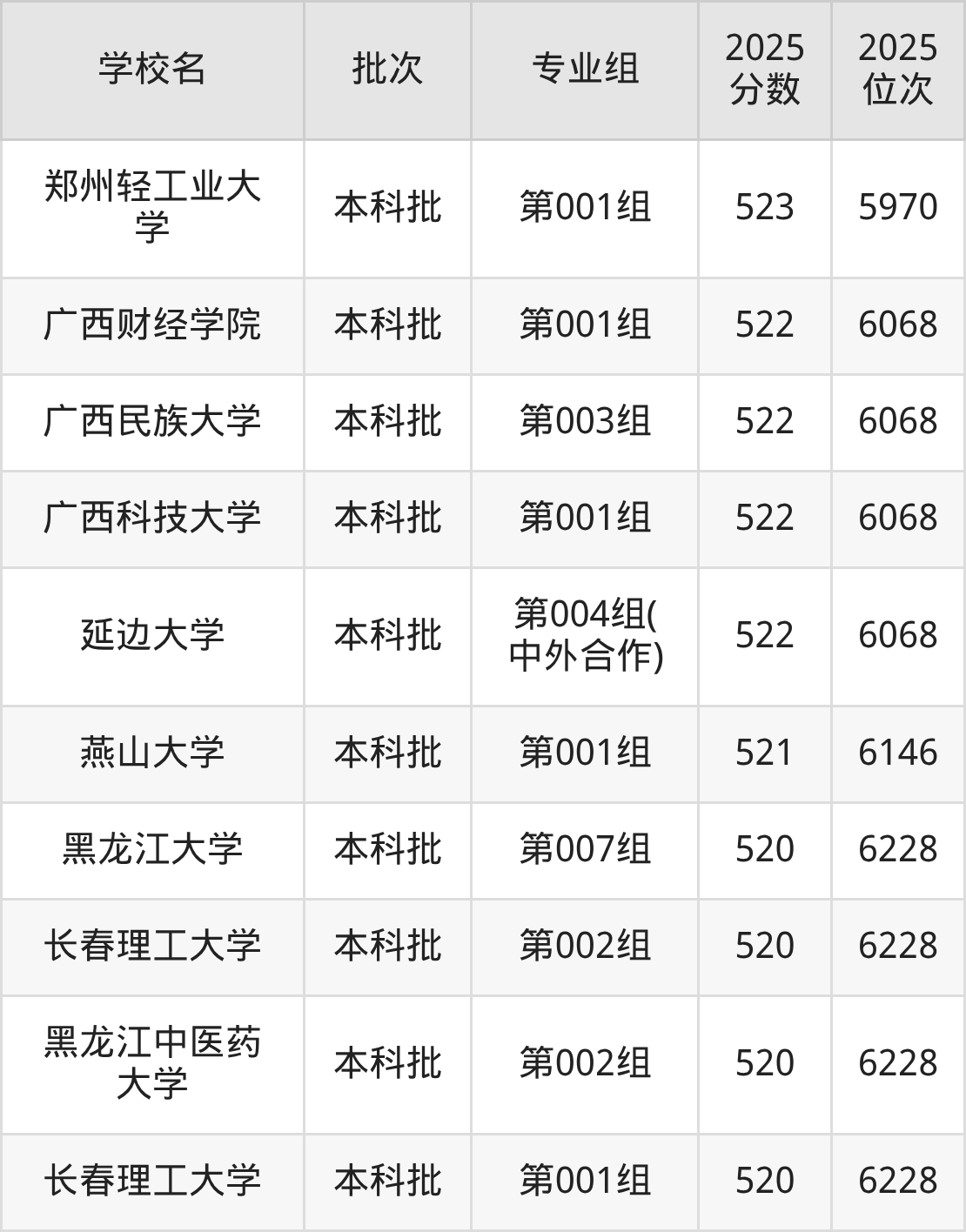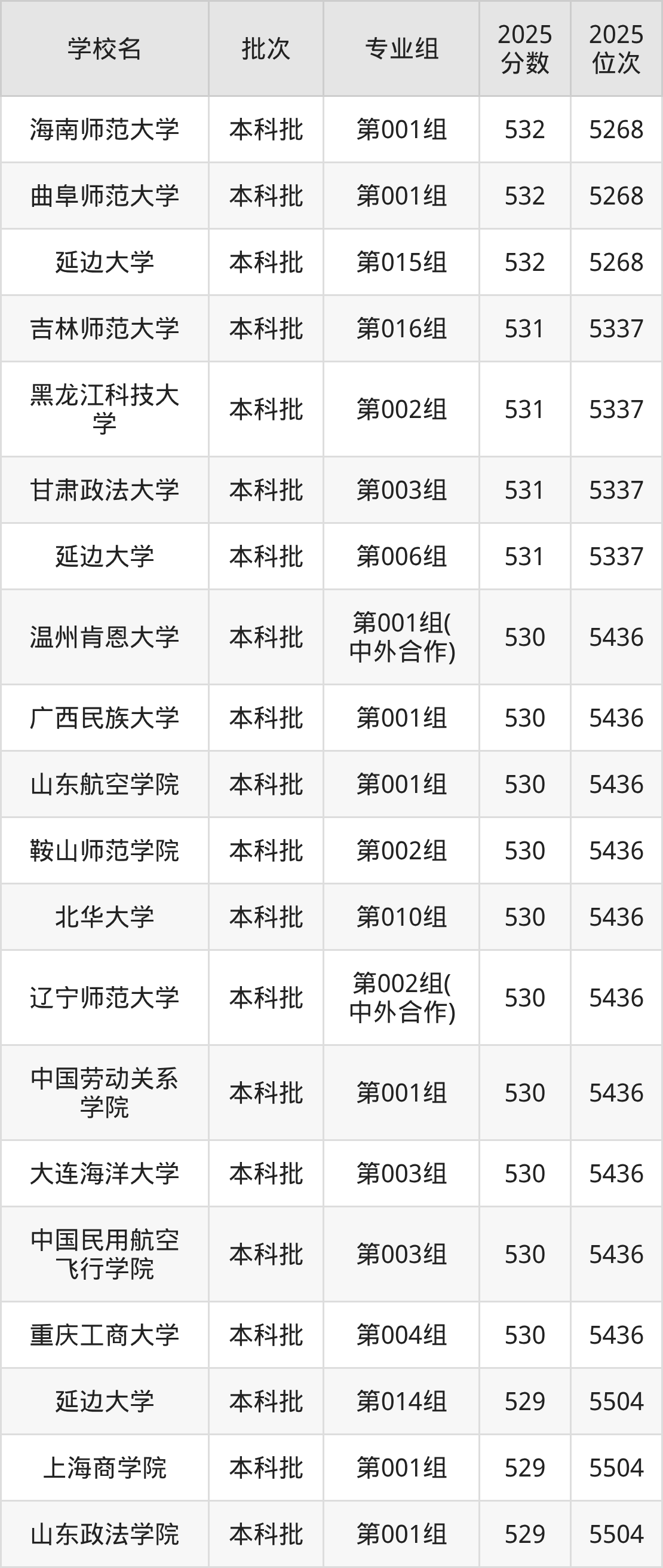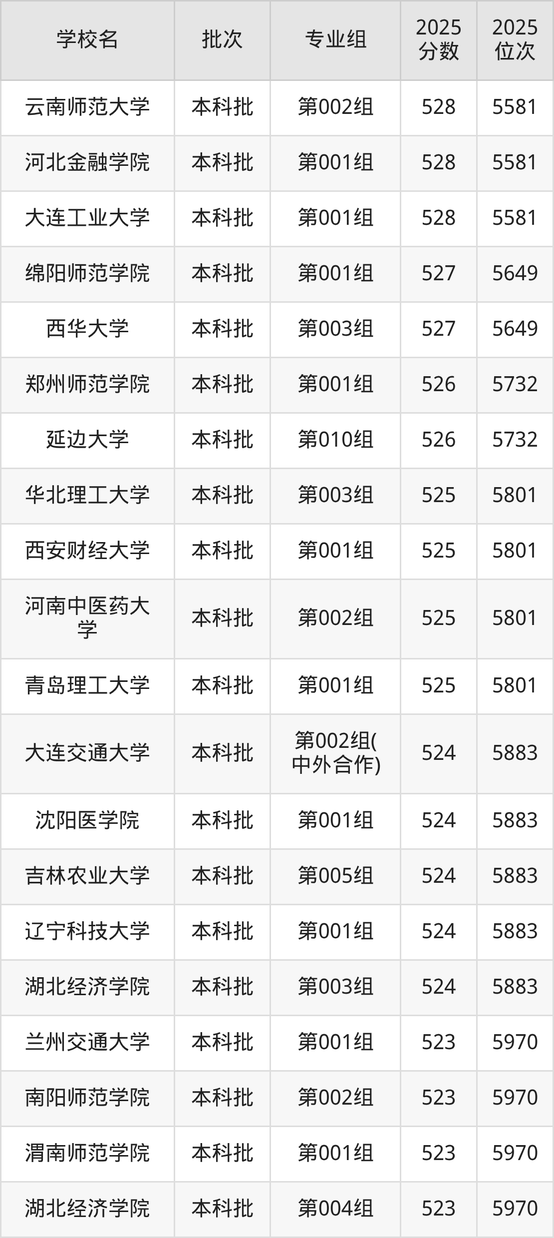 2025年吉林高考历史类525分(5733名~5801名)能上的大学有华北理工大学第003组、青岛理工大学第001组、河南中医药大学第002组、西安财经大学第001组。