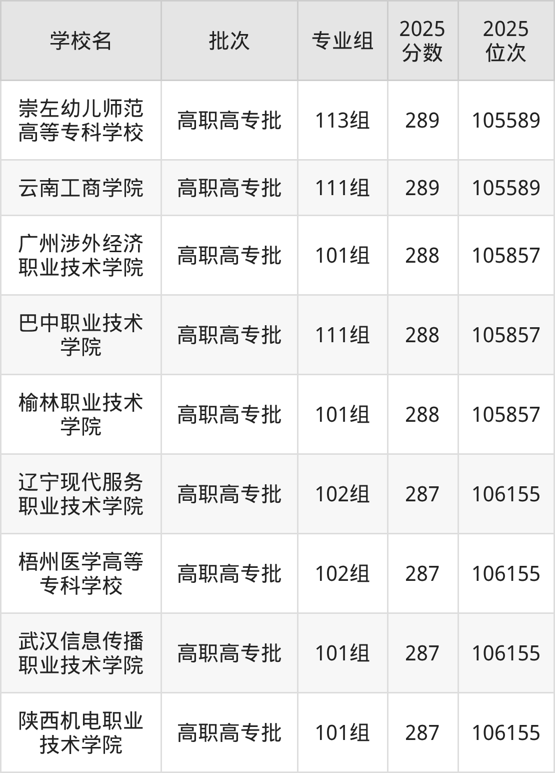 2025年广西高考历史类287分(105858名~106155名)能上的大学有武汉信息传播职业技术学院101组、辽宁现代服务职业技术学院102组、梧州医学高等专科学校102组、陕西机电职业技术学院101组。
