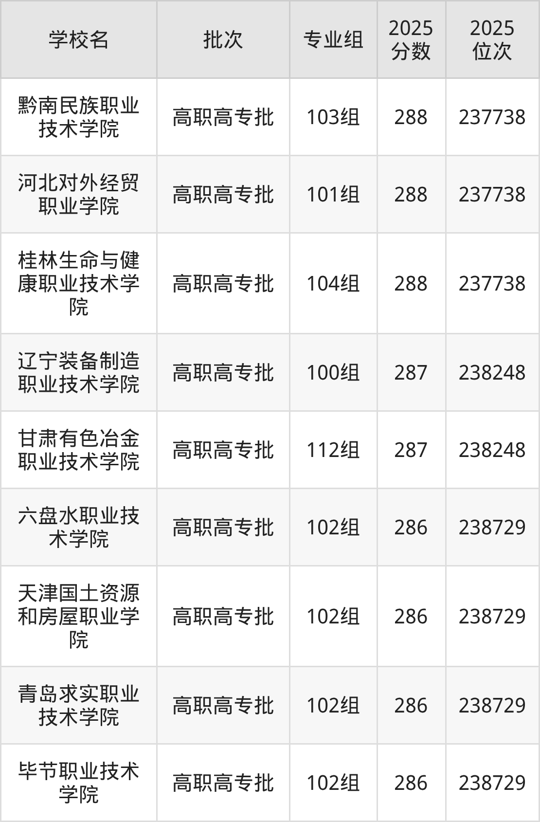 另外录取位次低于该区间(较稳妥)的有毕节职业技术学院102组(238729名)、天津国土资源和房屋职业学院102组(238729名)等;录取位次高于该区间(可冲)的有黔南民族职业技术学院103组(237738名)、桂林生命与健康职业技术学院104组(237738名)等。