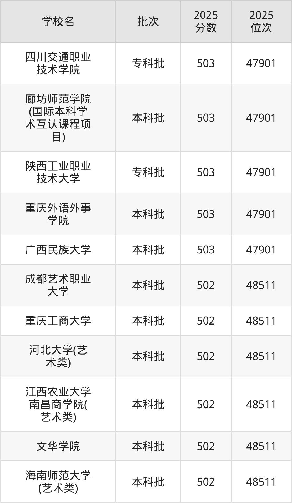 2025年河北高考历史类502分(47902名~48511名)能上的大学有重庆工商大学、海南师范大学(艺术类)、文华学院、江西农业大学南昌商学院(艺术类)等。