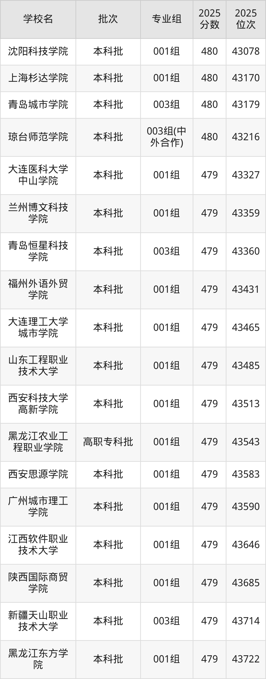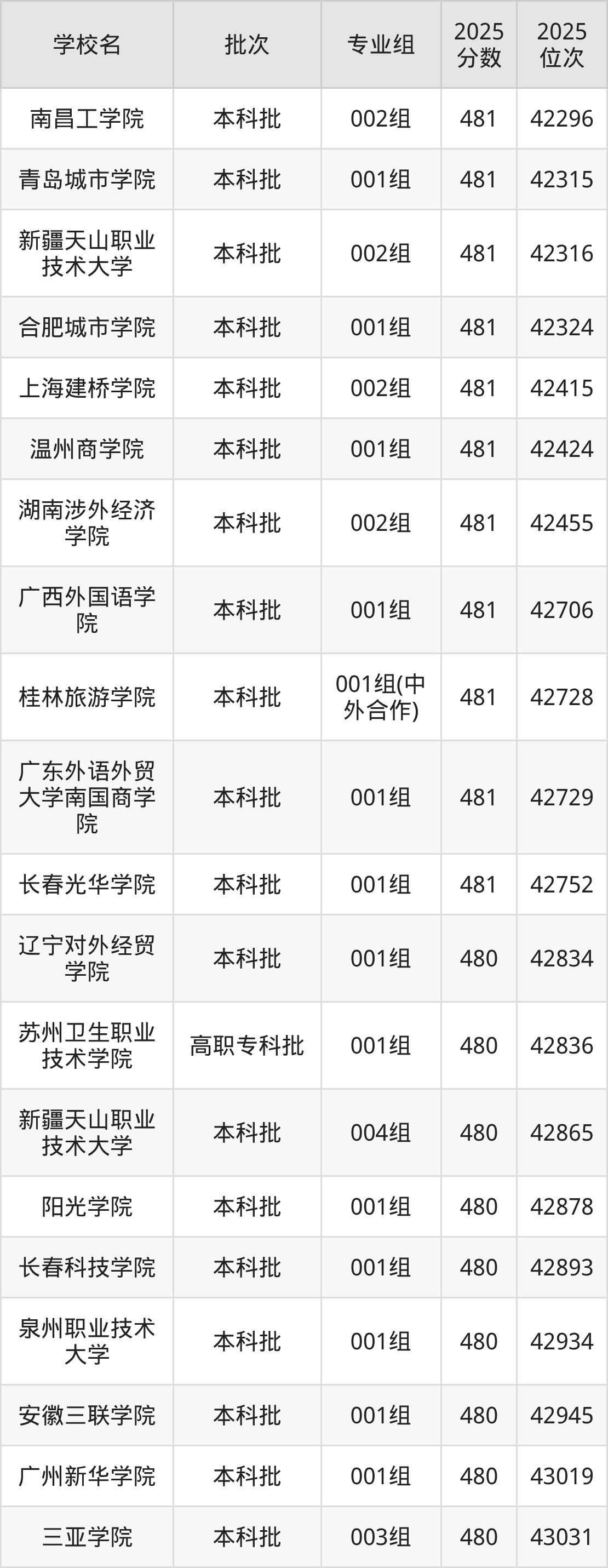 2025年安徽高考历史类480分(42776名~43266名)能上的大学有长春科技学院001组、广州新华学院001组、辽宁对外经贸学院001组、青岛城市学院003组等。