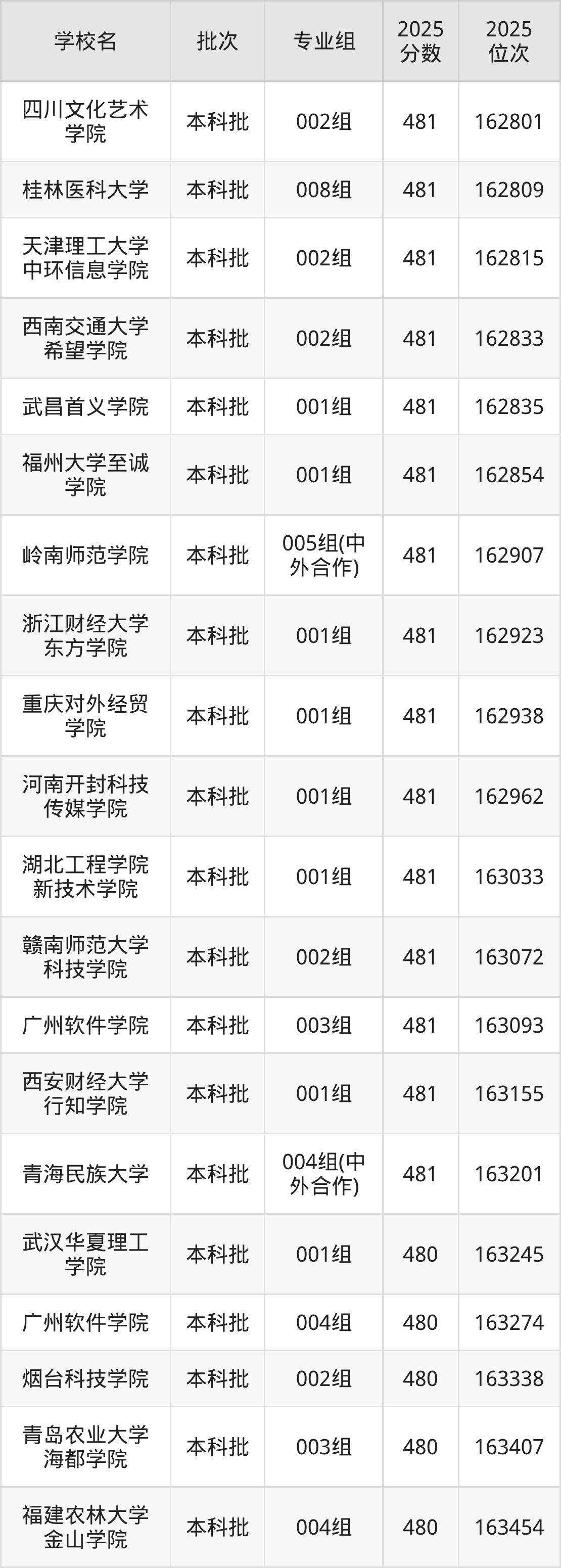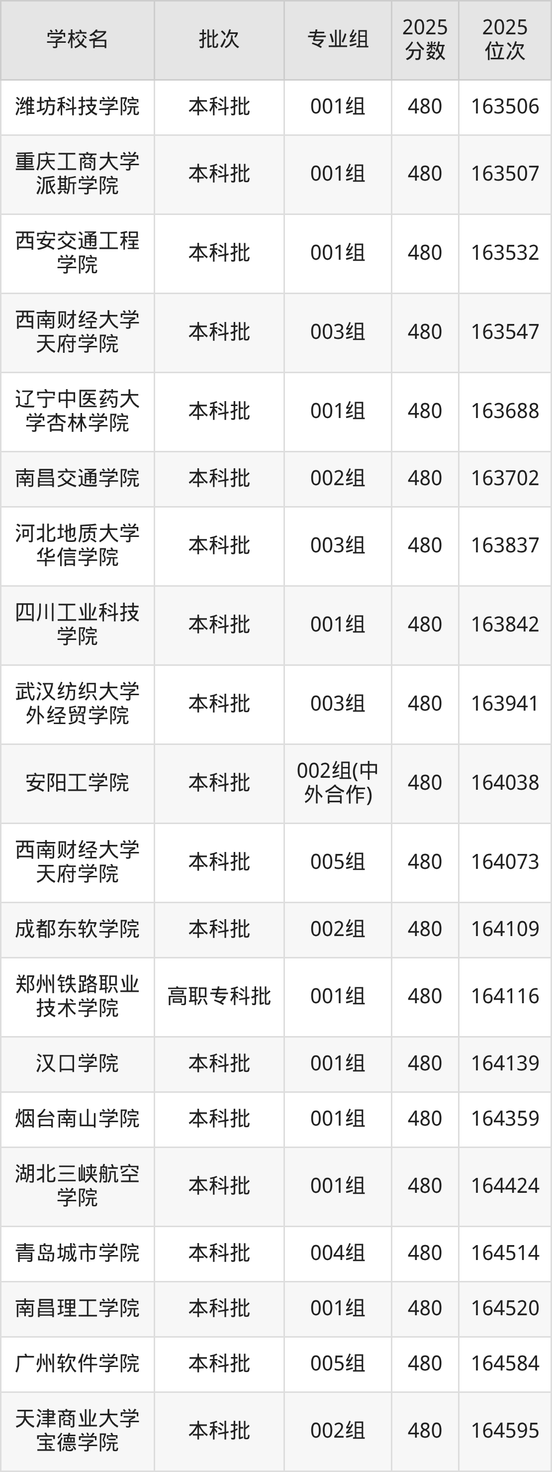 2025年安徽高考物理类480分(163202名~164647名)能上的大学有安阳工学院002组(中外合作)、成都东软学院002组、广州软件学院004组、广州软件学院005组等。