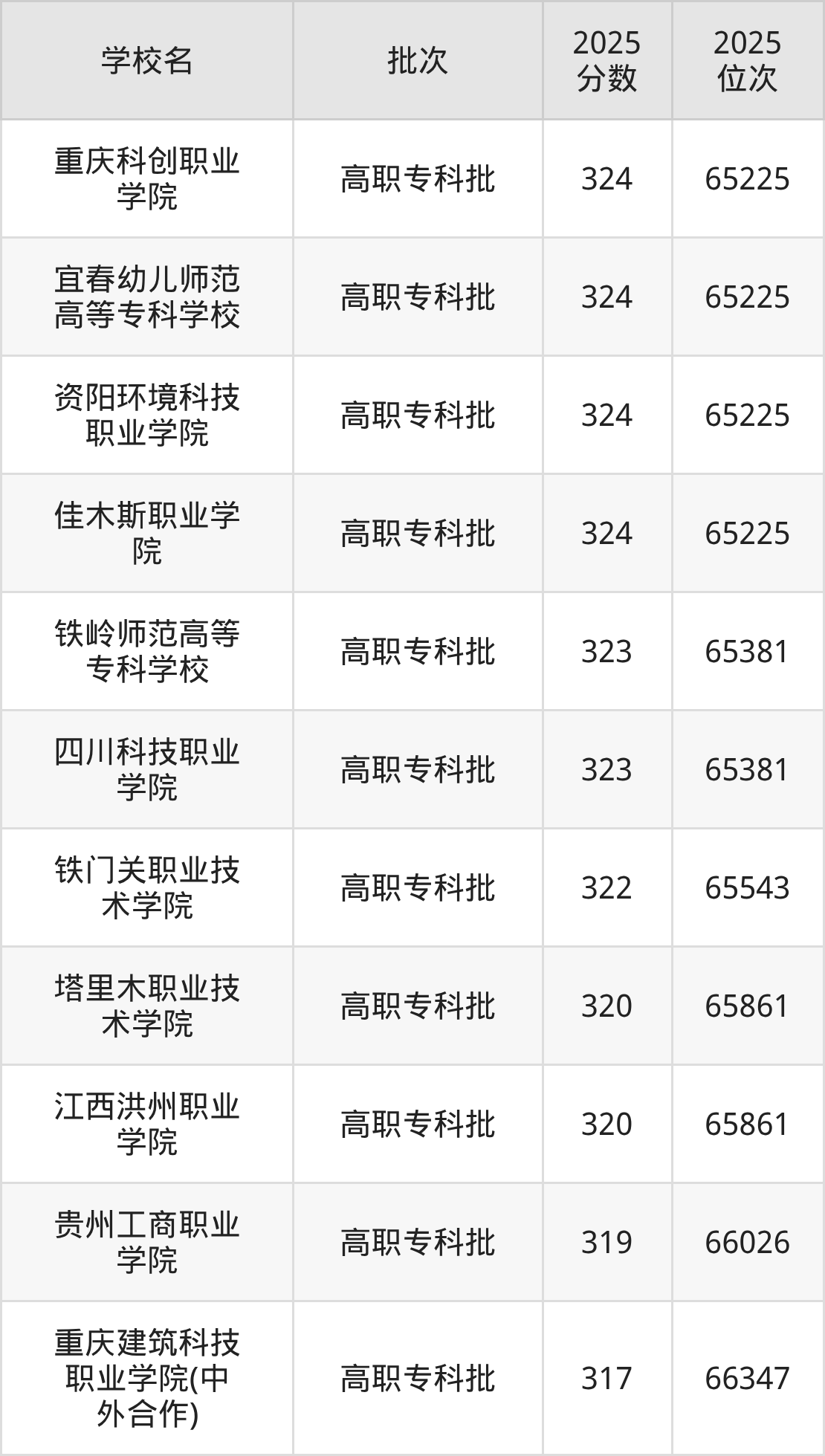 2025年重庆高考历史类320分(65686名~65861名)能上的大学有塔里木职业技术学院、江西洪州职业学院。