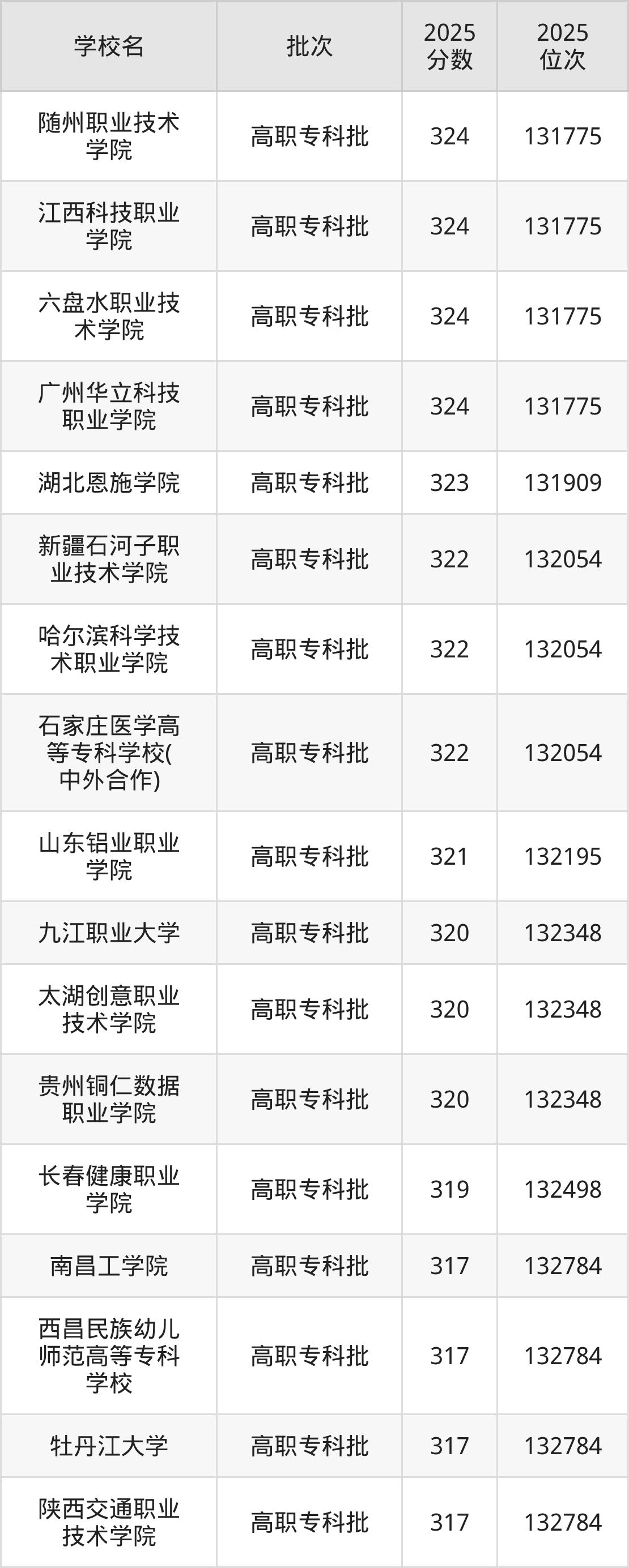 2025年重庆高考物理类320分(132196名~132348名)能上的大学有贵州铜仁数据职业学院、太湖创意职业技术学院、九江职业大学。