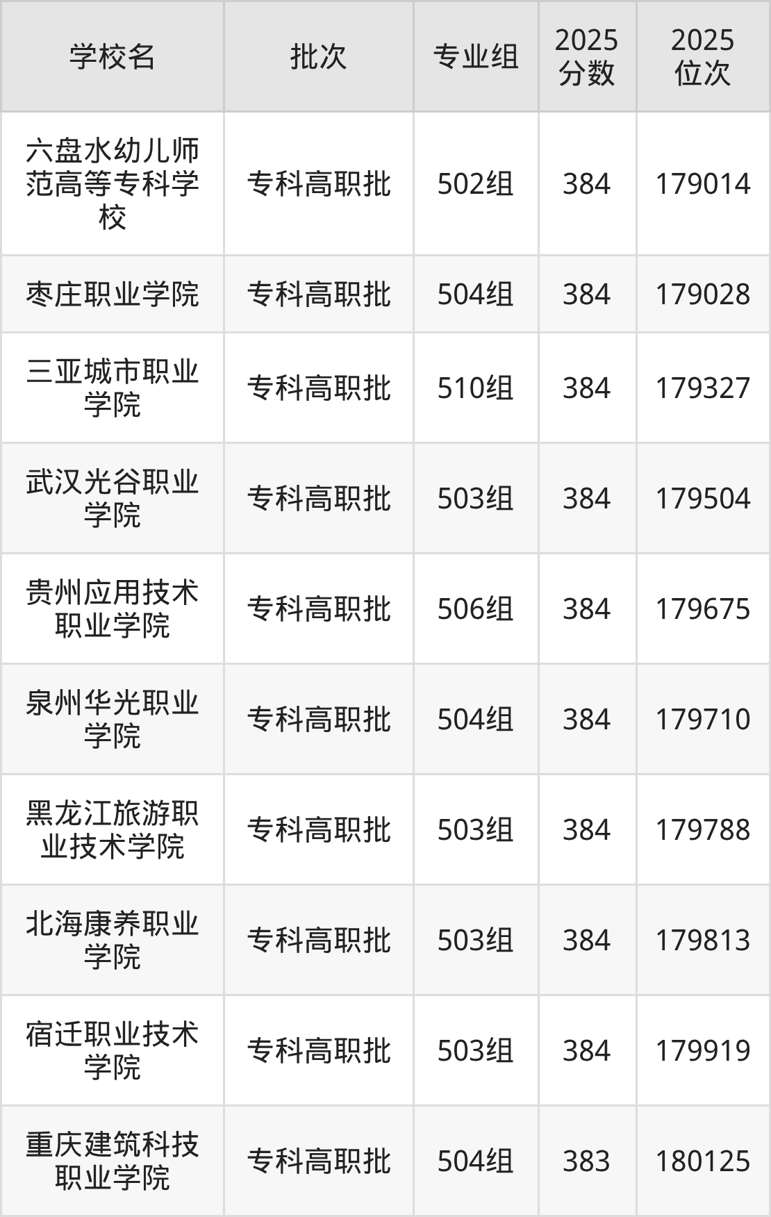 2025年广东高考历史类384分(178756名~179909名)能上的大学有三亚城市职业学院510组、泉州华光职业学院504组、宿迁职业技术学院503组、黑龙江旅游职业技术学院503组等。