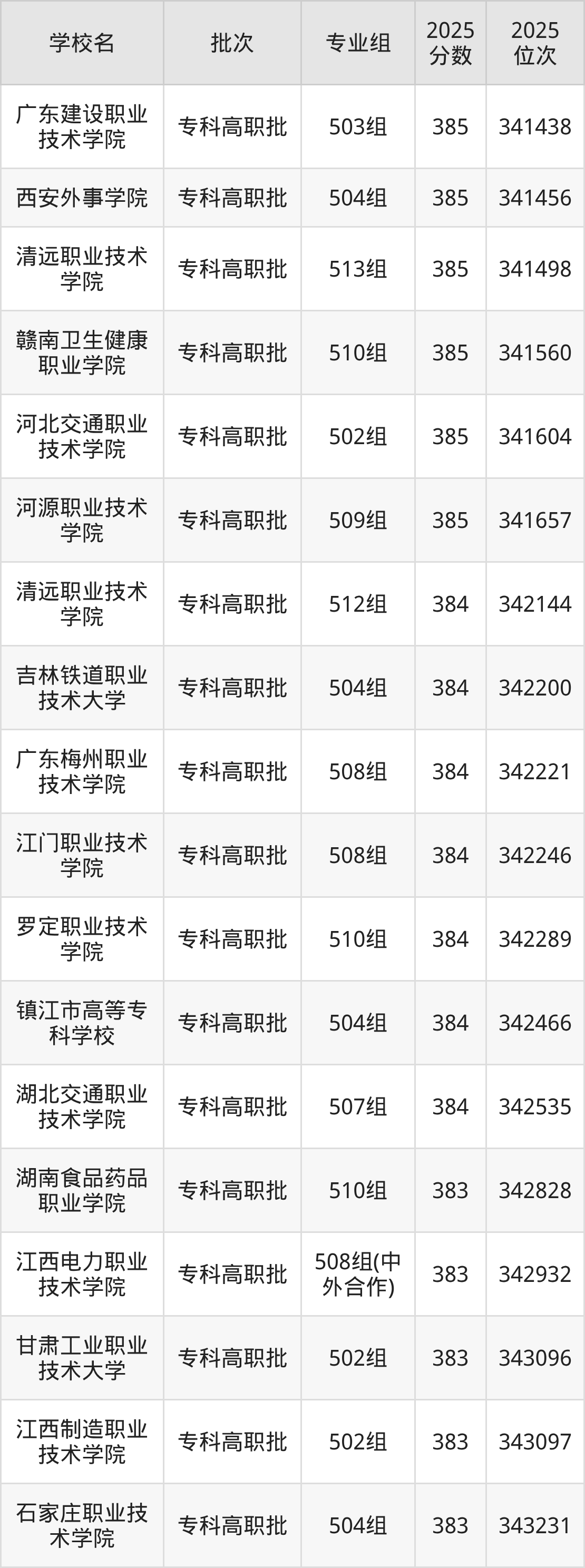 2025年广东高考物理类384分(341782名~342787名)能上的大学有镇江市高等专科学校504组、湖北交通职业技术学院507组、罗定职业技术学院510组、清远职业技术学院512组等。
