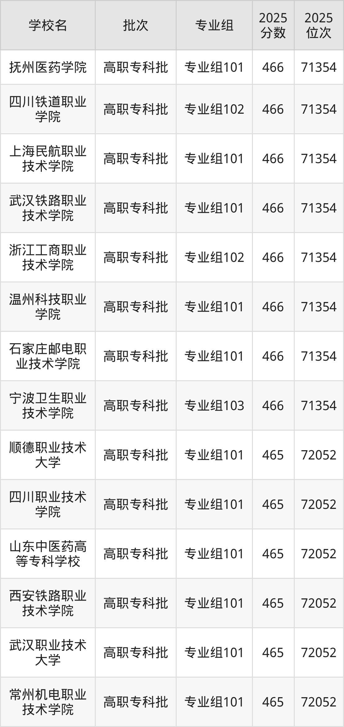 2025年四川高考历史类465分(71355名~72052名)能上的大学有常州机电职业技术学院专业组101、武汉职业技术大学专业组101、山东中医药高等专科学校专业组101、四川职业技术学院专业组101等。