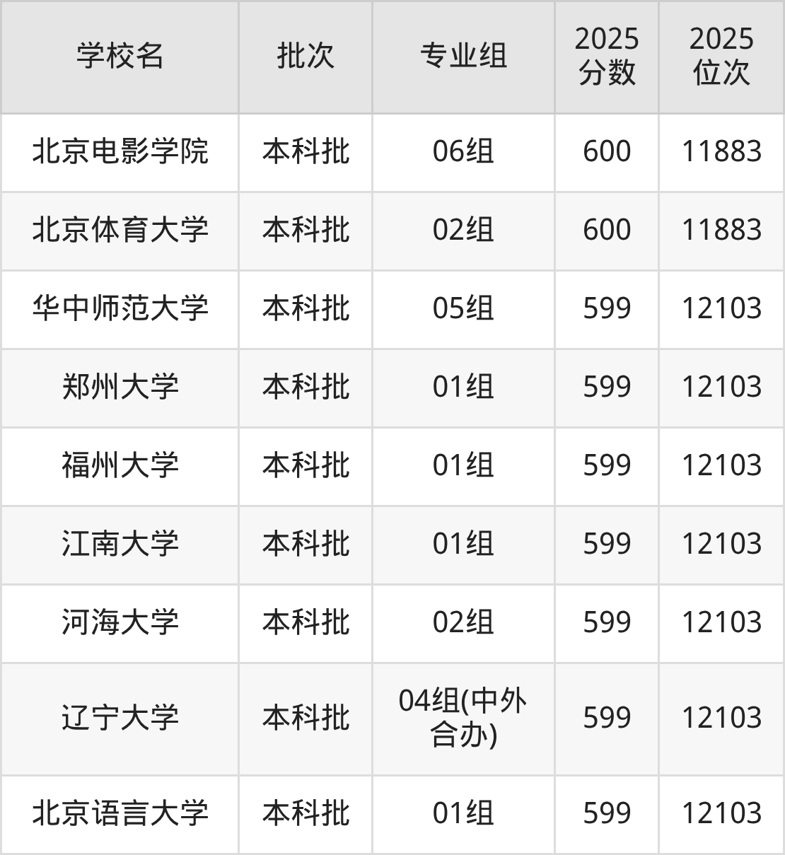 2025年北京高考601分(11427名~11659名)能上的大学有中央美术学院02组、北京体育大学07组、辽宁大学01组、南京农业大学01组等。