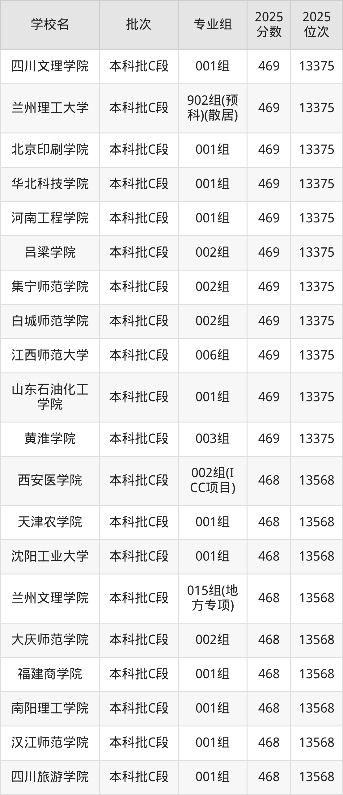 2025年甘肃高考历史类468分(13376名~13568名)能上的大学有天津农学院001组、沈阳工业大学001组、大庆师范学院002组、福建商学院001组等。