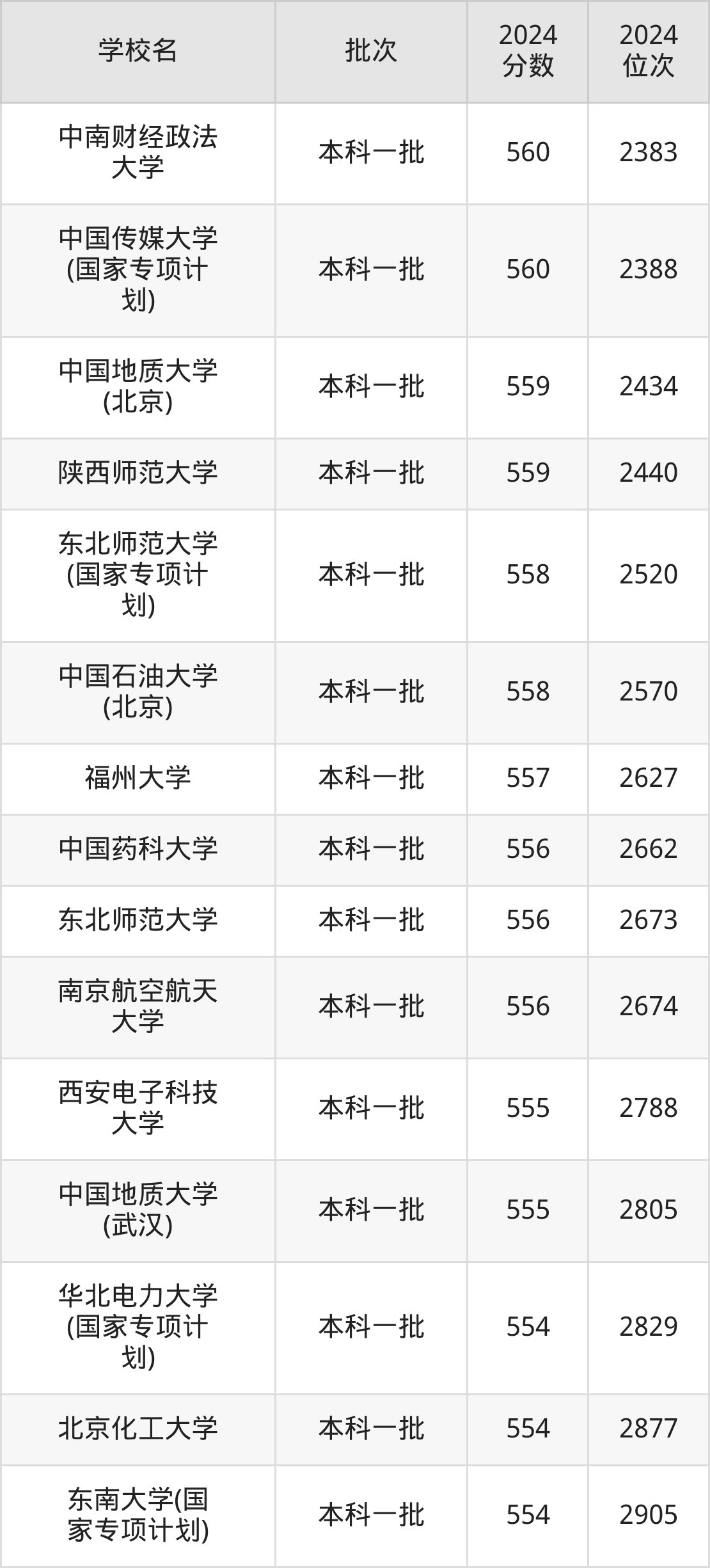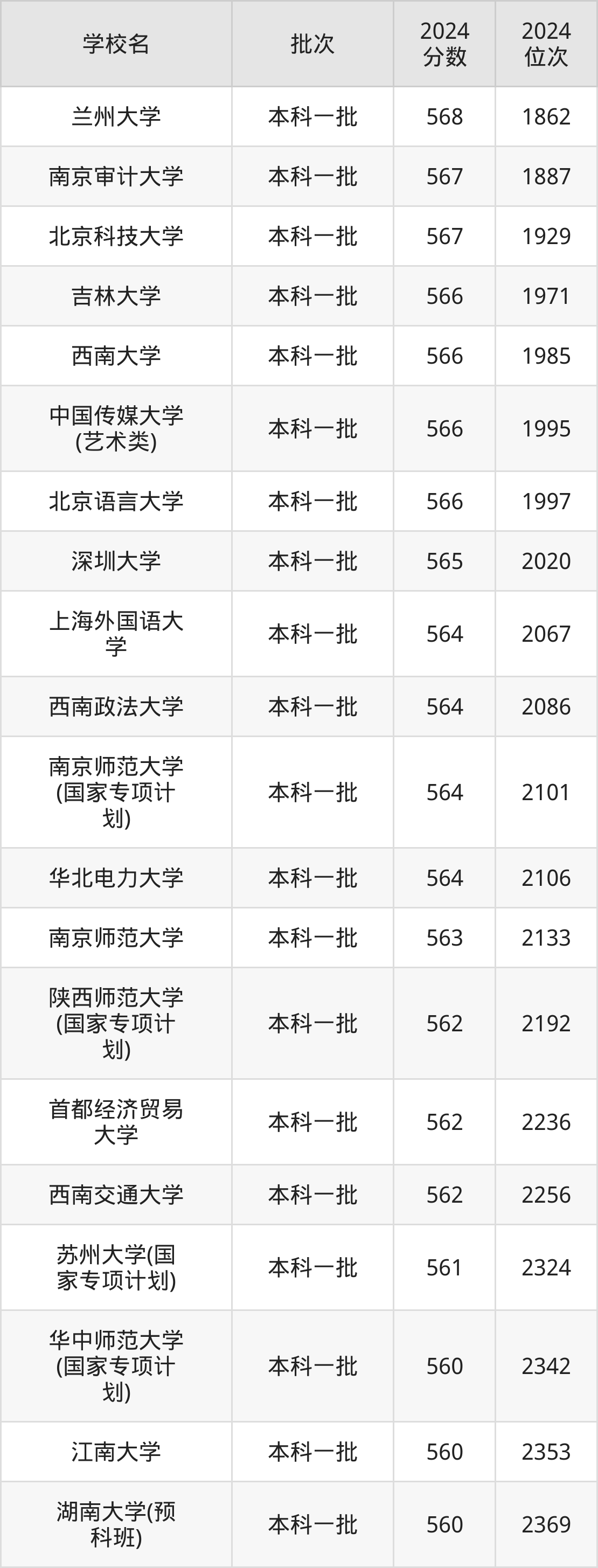 2024年陕西高考文科560分(2329名~2424名)能上的大学有江南大学、中南财经政法大学、湖南大学(预科班)、中国传媒大学(国家专项计划)等。