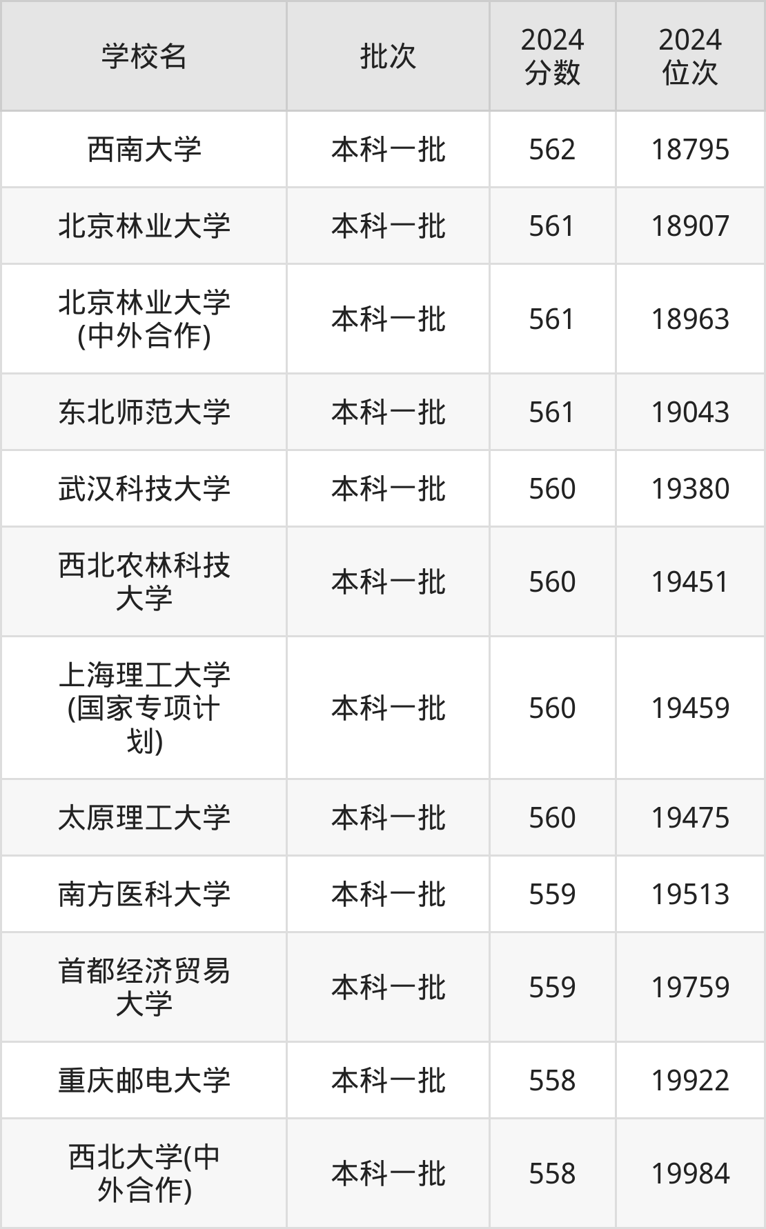 2024年陕西高考理科560分(19154名~19496名)能上的大学有太原理工大学、武汉科技大学、西北农林科技大学、上海理工大学(国家专项计划)。