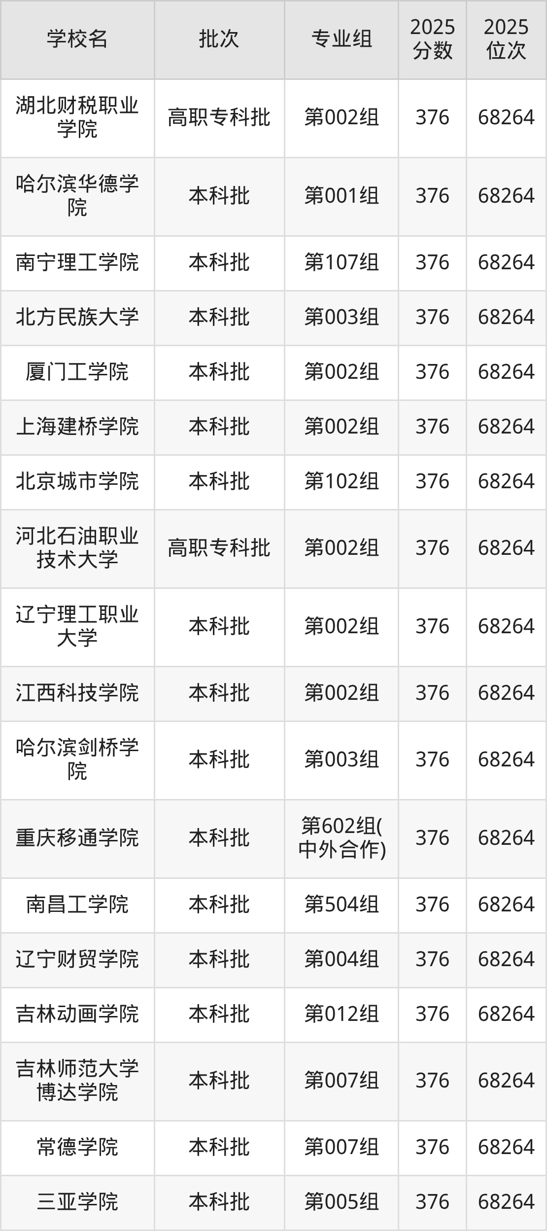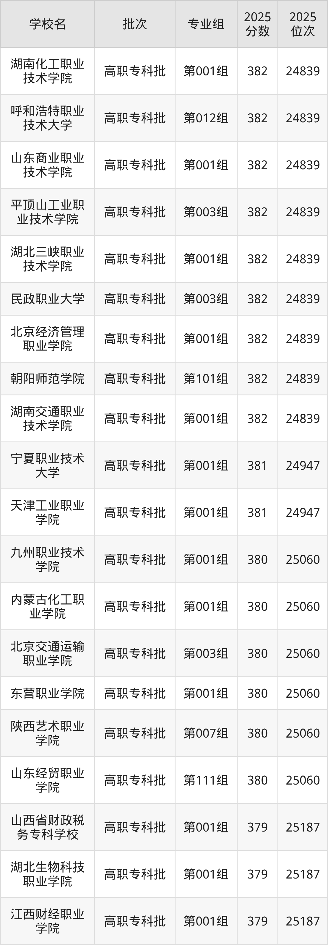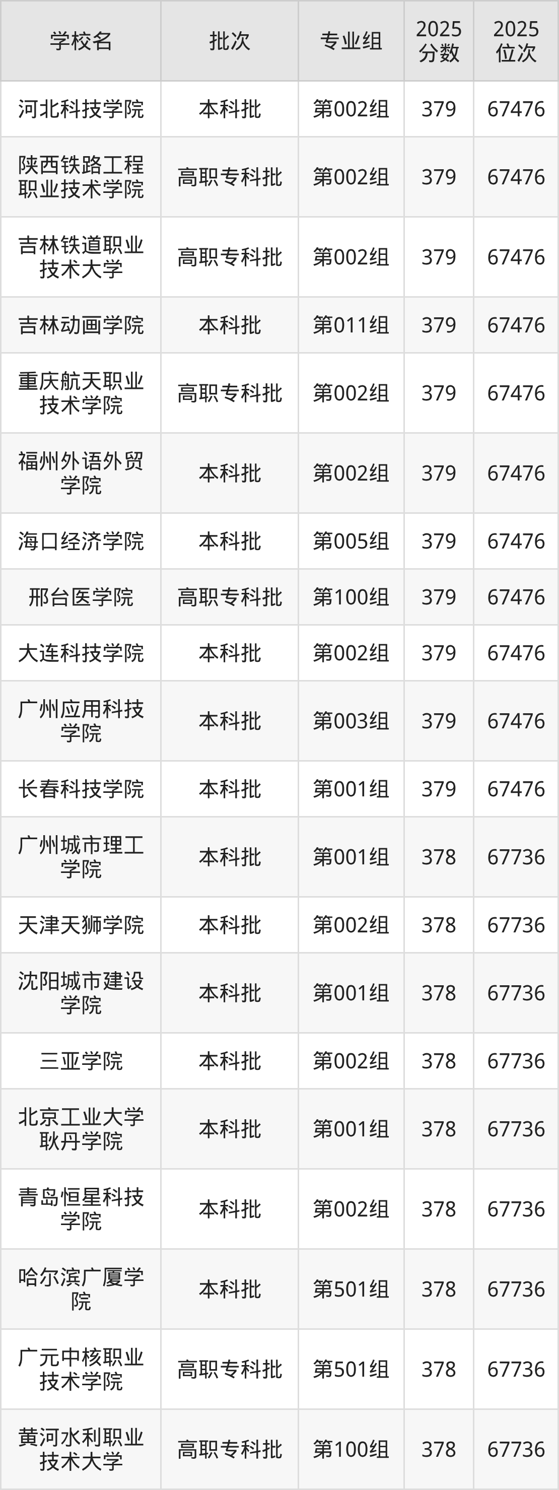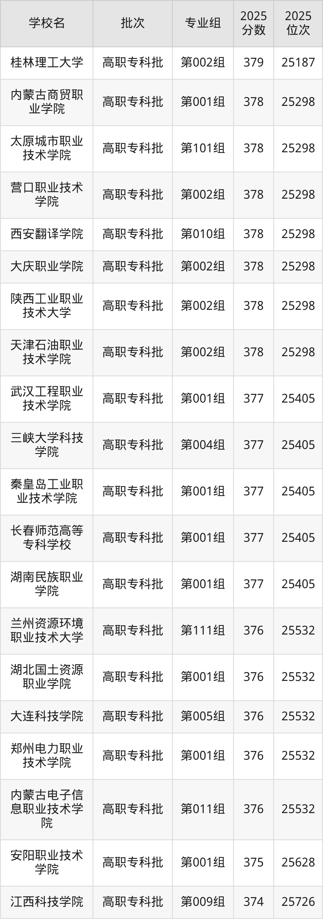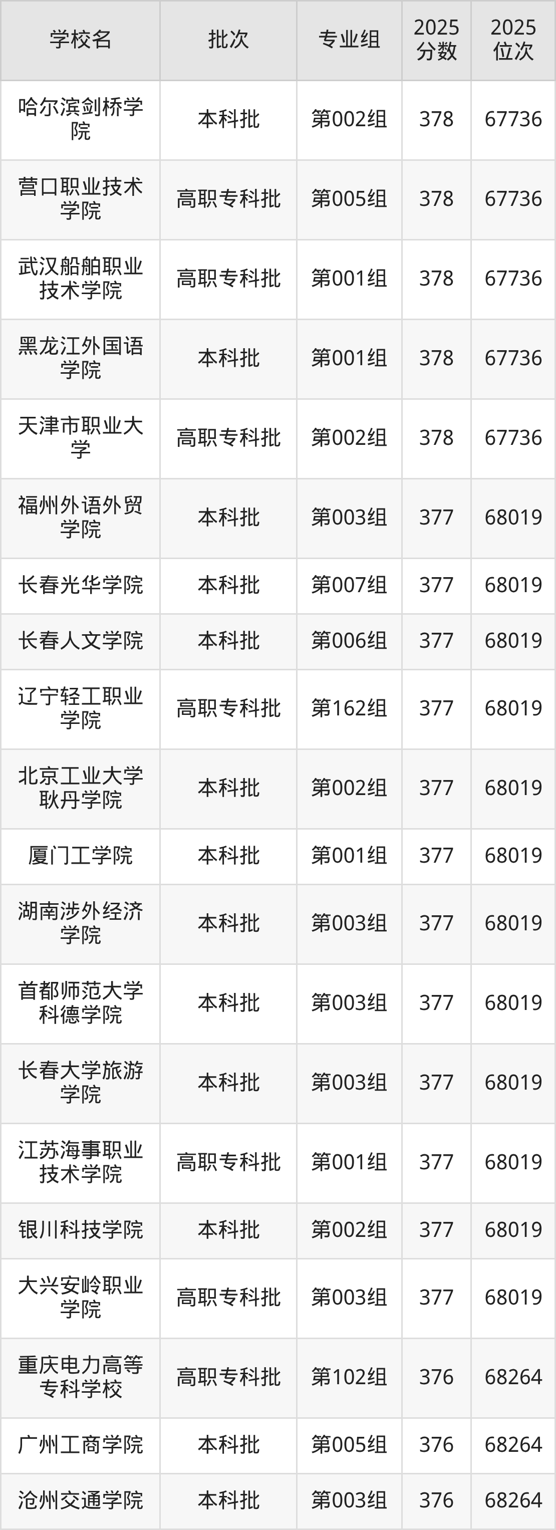 2025年内蒙古高考历史类377分(25299名~25405名)能上的大学有湖南民族职业学院第001组、长春师范高等专科学校第001组、秦皇岛工业职业技术学院第001组、三峡大学科技学院第004组等。