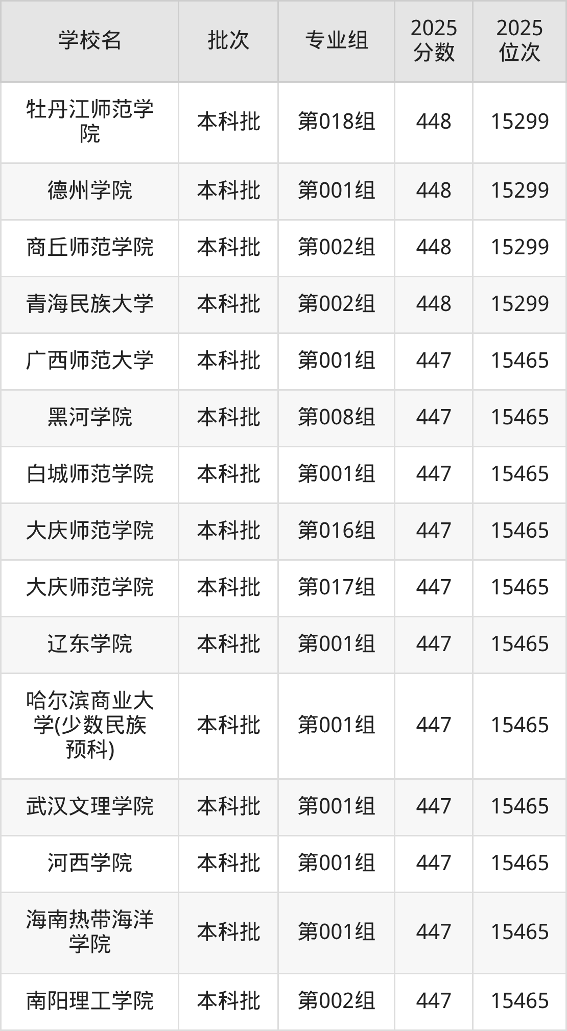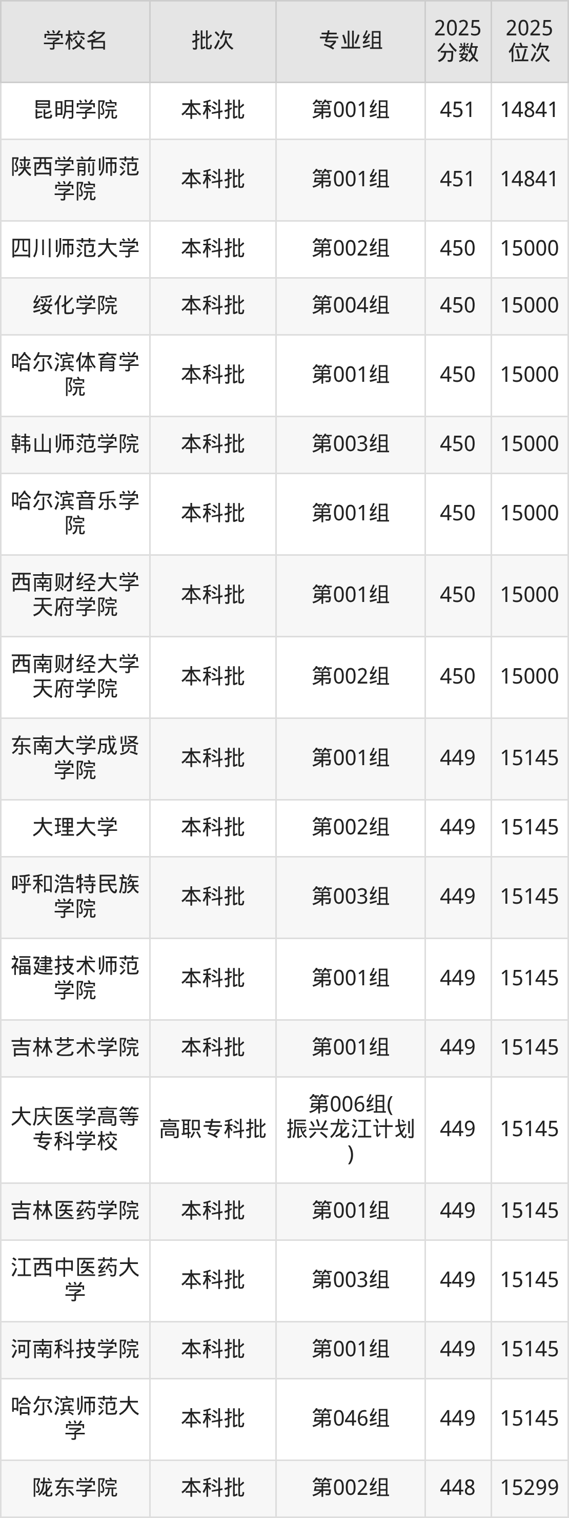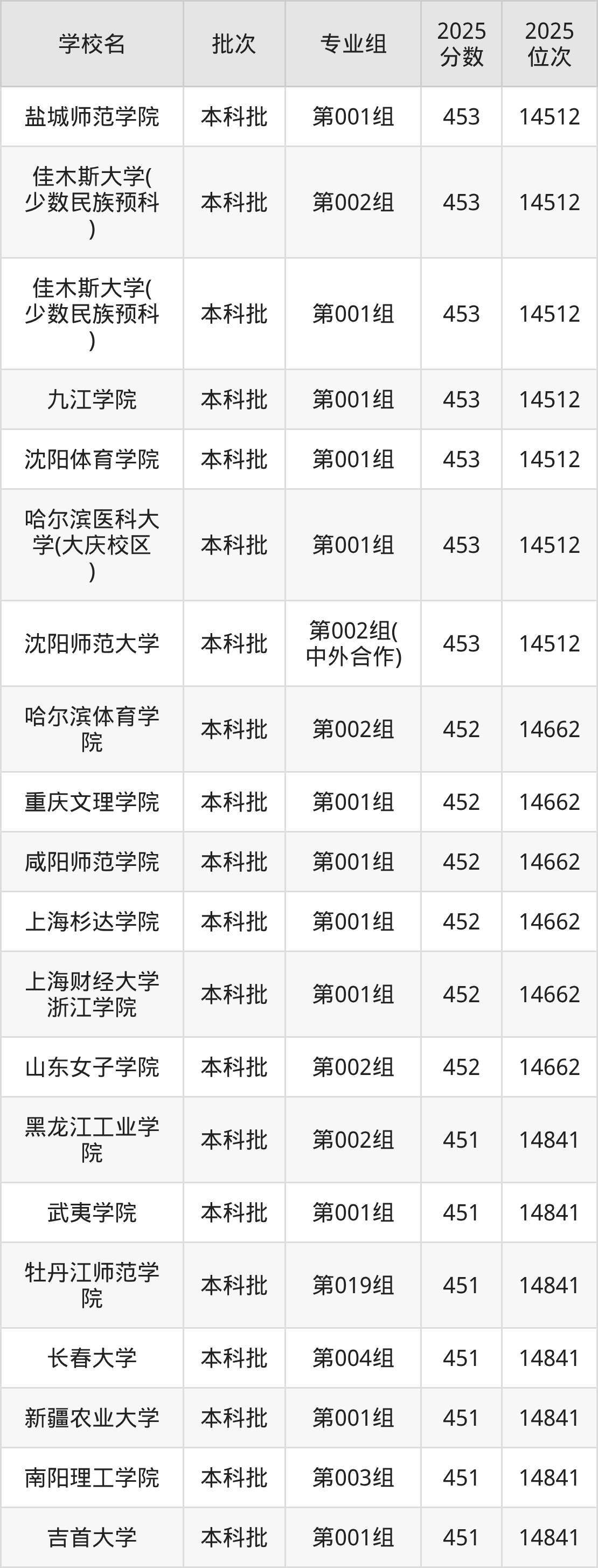 2025年黑龙江高考历史类450分(14842名~15000名)能上的大学有绥化学院第004组、哈尔滨体育学院第001组、哈尔滨音乐学院第001组、韩山师范学院第003组等。