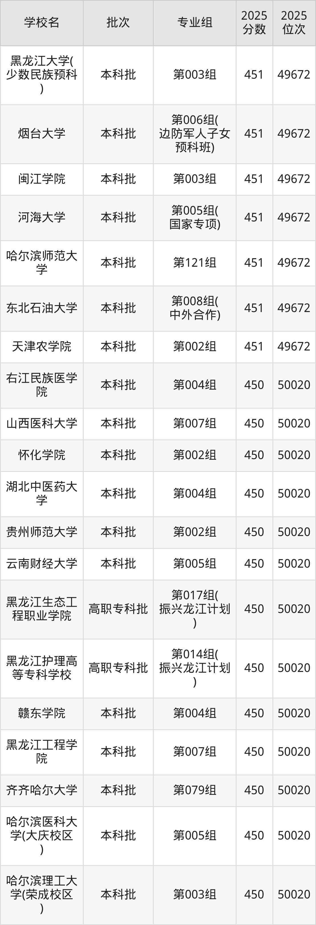 二、黑龙江450分位次排名能上的大学
