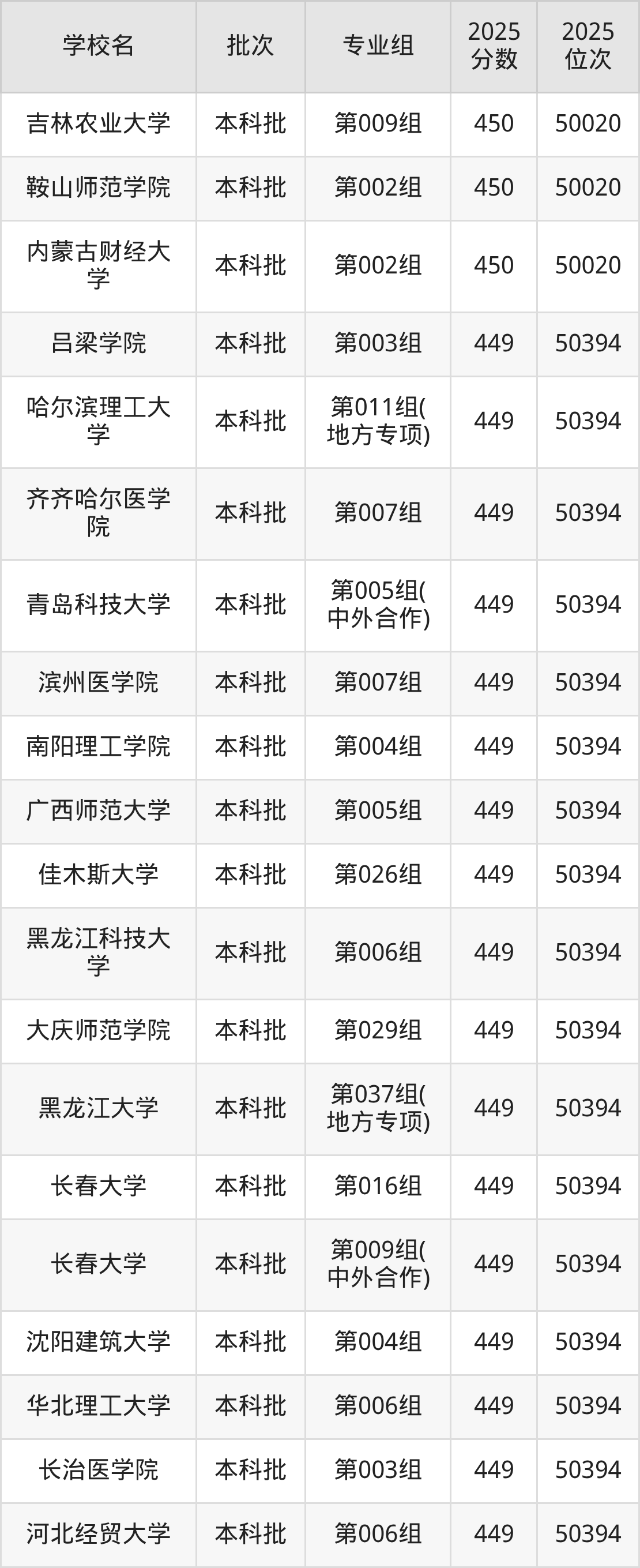 2025年黑龙江高考物理类450分(49673名~50020名)能上的大学有山西医科大学第007组、内蒙古财经大学第002组、鞍山师范学院第002组、吉林农业大学第009组等。