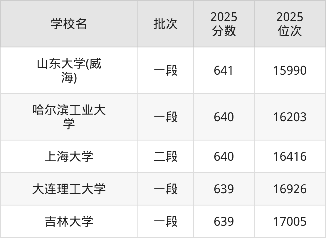 另外录取位次低于该区间(较稳妥)的有大连理工大学(16926名)、吉林大学(17005名)等;录取位次高于该区间(可冲)的有山东大学(威海)(15990名)、兰州大学(15604名)等。