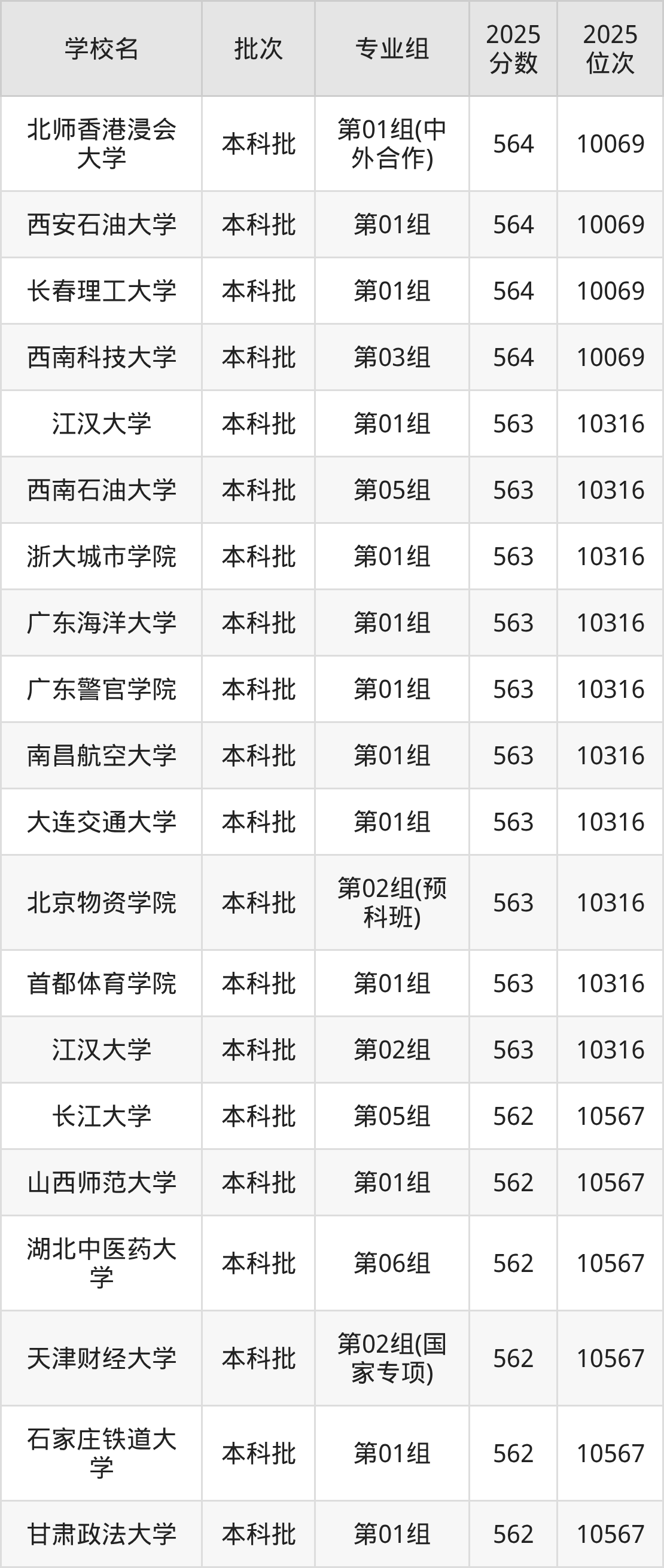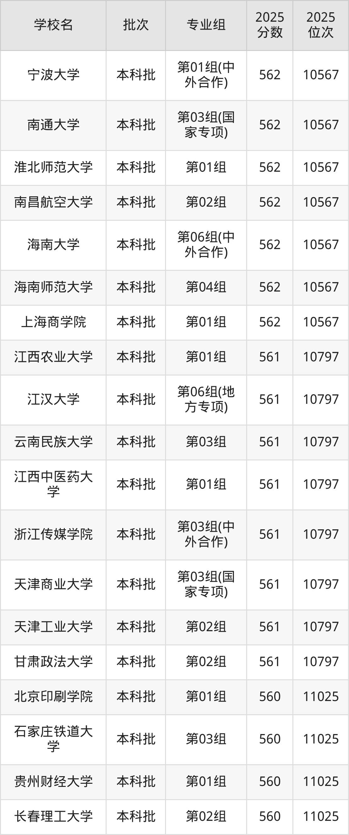 2025年湖北高考历史类561分(10568名~10797名)能上的大学有江汉大学第06组(地方专项)、天津工业大学第02组、天津商业大学第03组(国家专项)、浙江传媒学院第03组(中外合作)等。