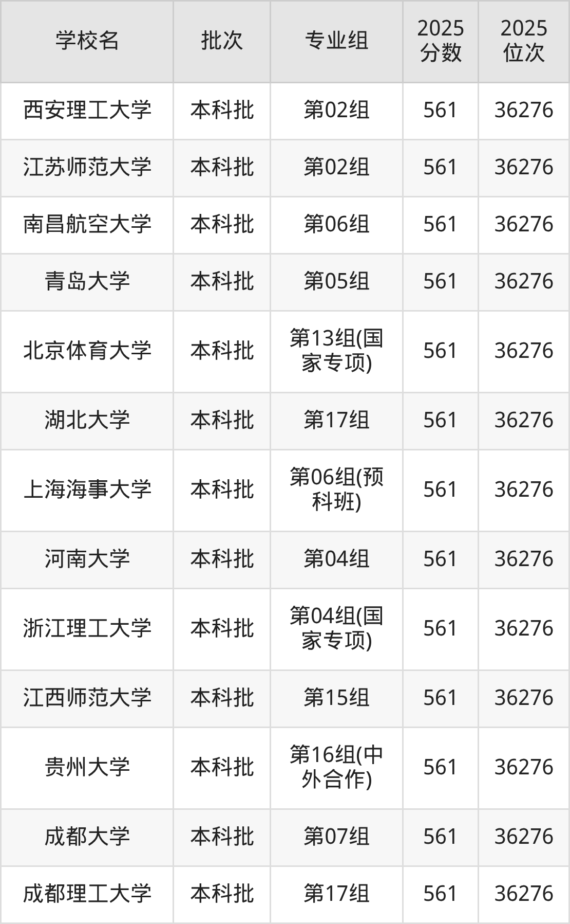 湖北高考561分:历史类排名10797位、物理类排名36276位。该分数位次对应能上的大学历史类有江汉大学第06组(地方专项)、天津工业大学第02组;物理类有北京体育大学第13组(国家专项)、湖北大学第17组,更多名单如下文所示,2026届考生可参考。