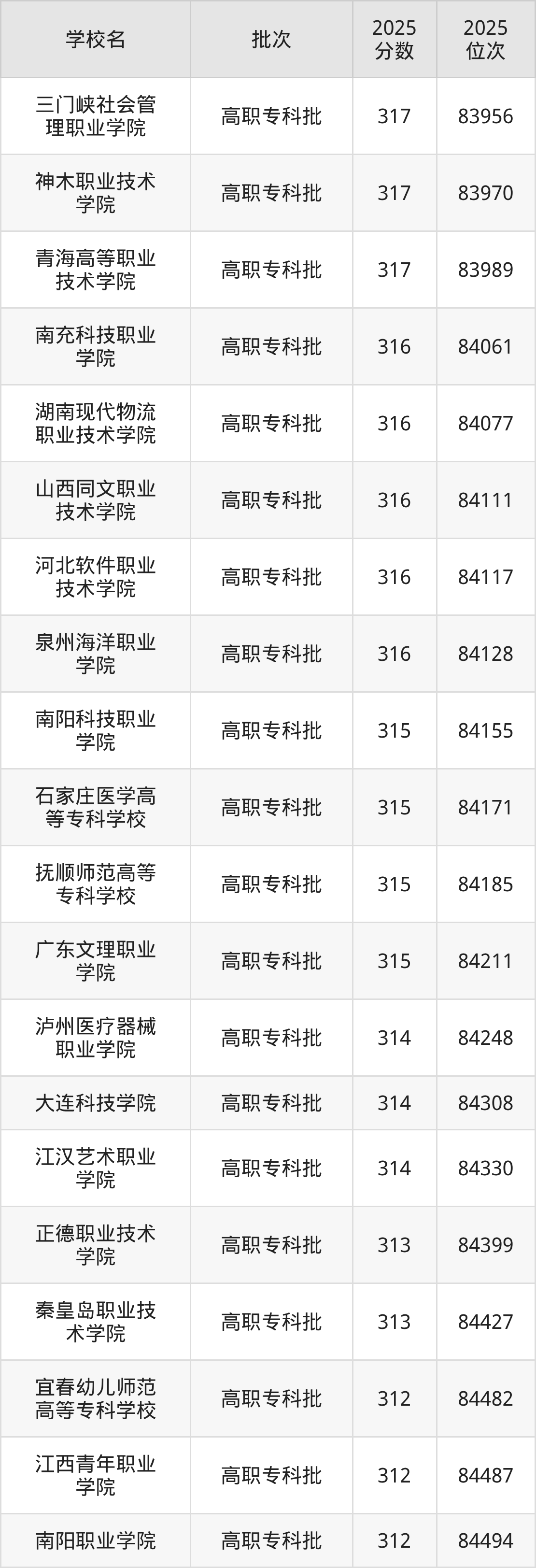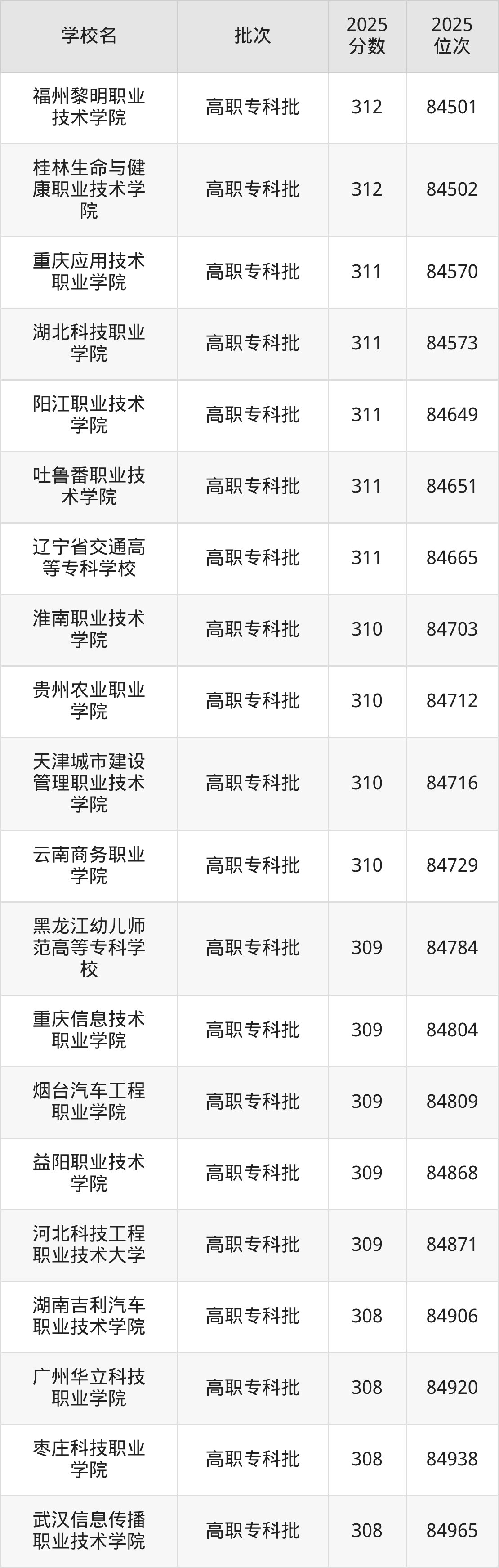 2025年贵州高考历史类312分(84456名~84553名)能上的大学有宜春幼儿师范高等专科学校、福州黎明职业技术学院、桂林生命与健康职业技术学院、南阳职业学院等。
