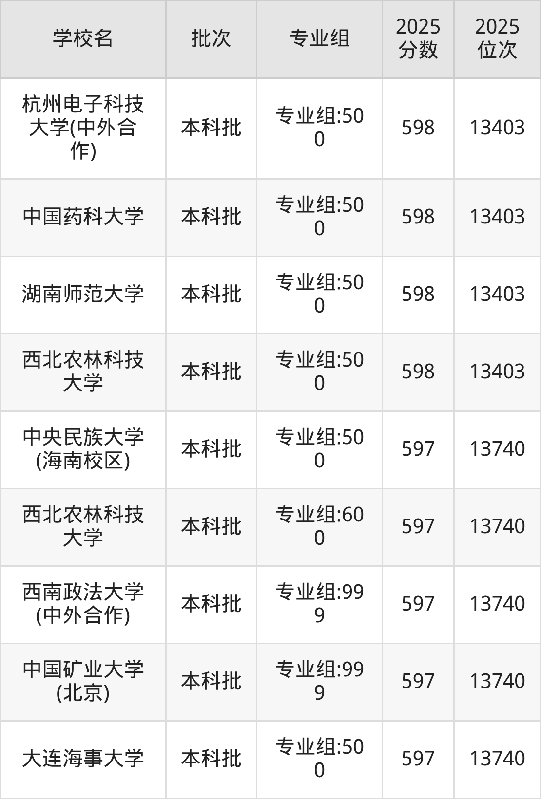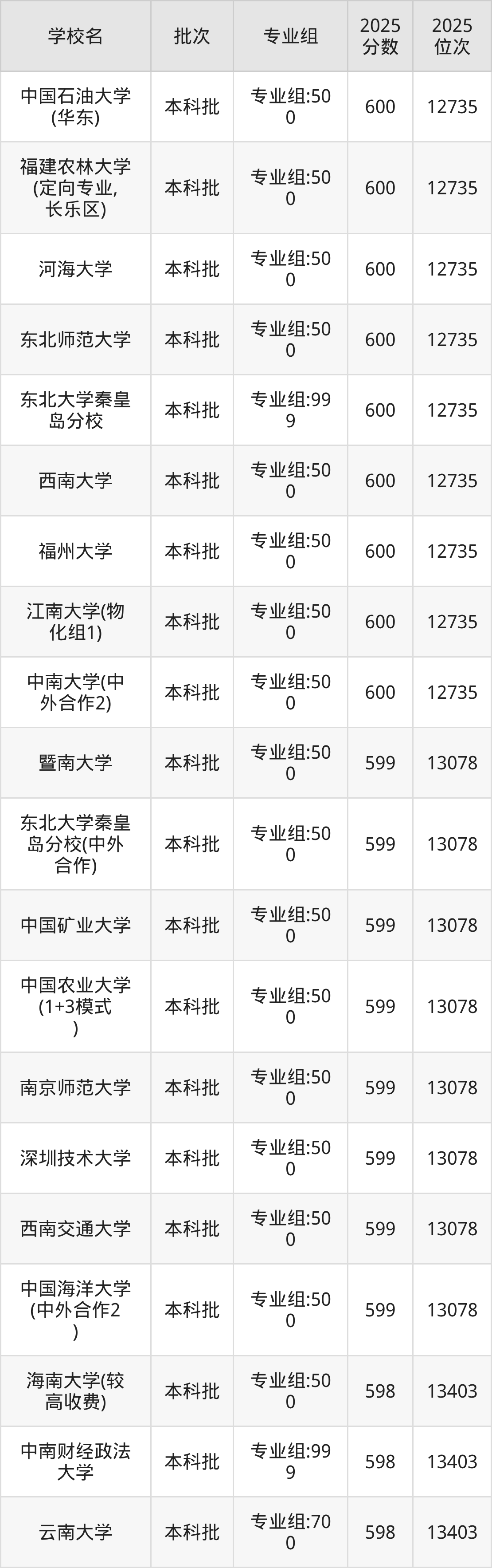 2025年福建高考物理类598分(13079名~13403名)能上的大学有海南大学(较高收费)专业组:500、杭州电子科技大学(中外合作)专业组:500、湖南师范大学专业组:500、西北农林科技大学专业组:500等。