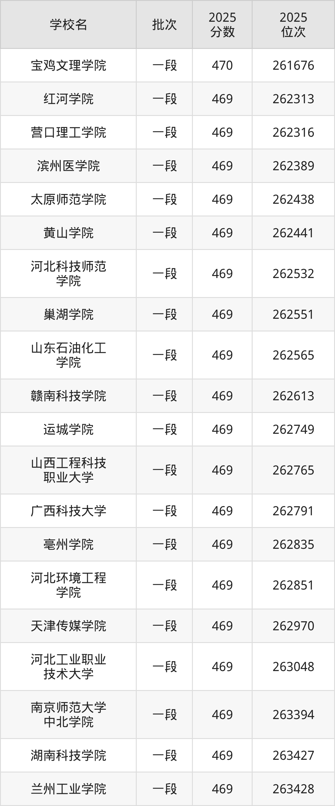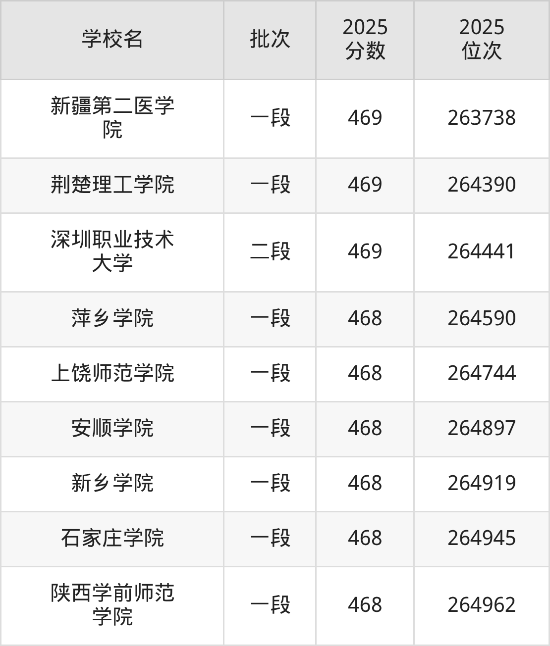 这些都是2026年高考261978名~264465名考生可以报考的大学,更多学校名单如下表所示: