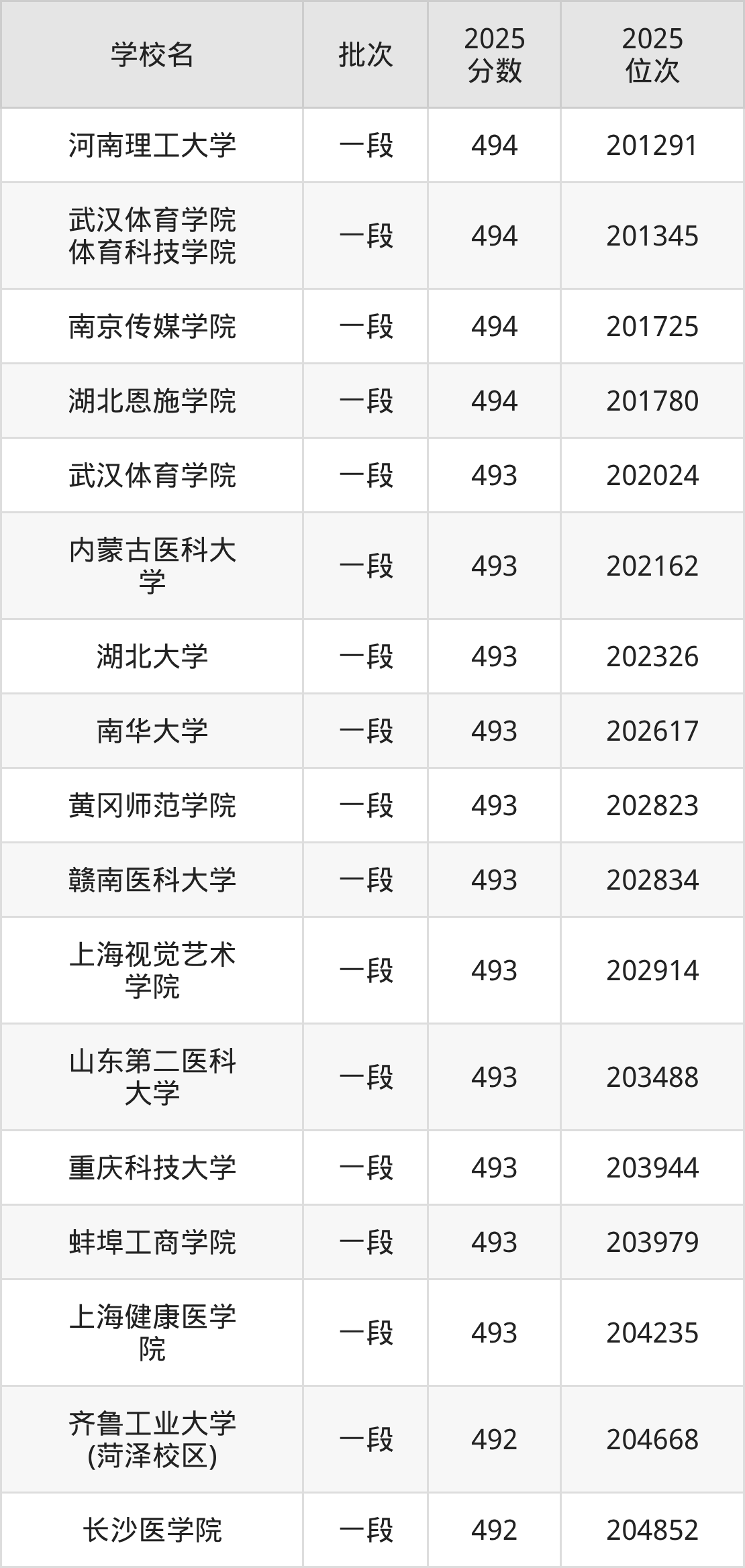 2025年山东高考493分(201792名~204390名)能上的大学有武汉体育学院、赣南医科大学、重庆科技大学、上海视觉艺术学院等。