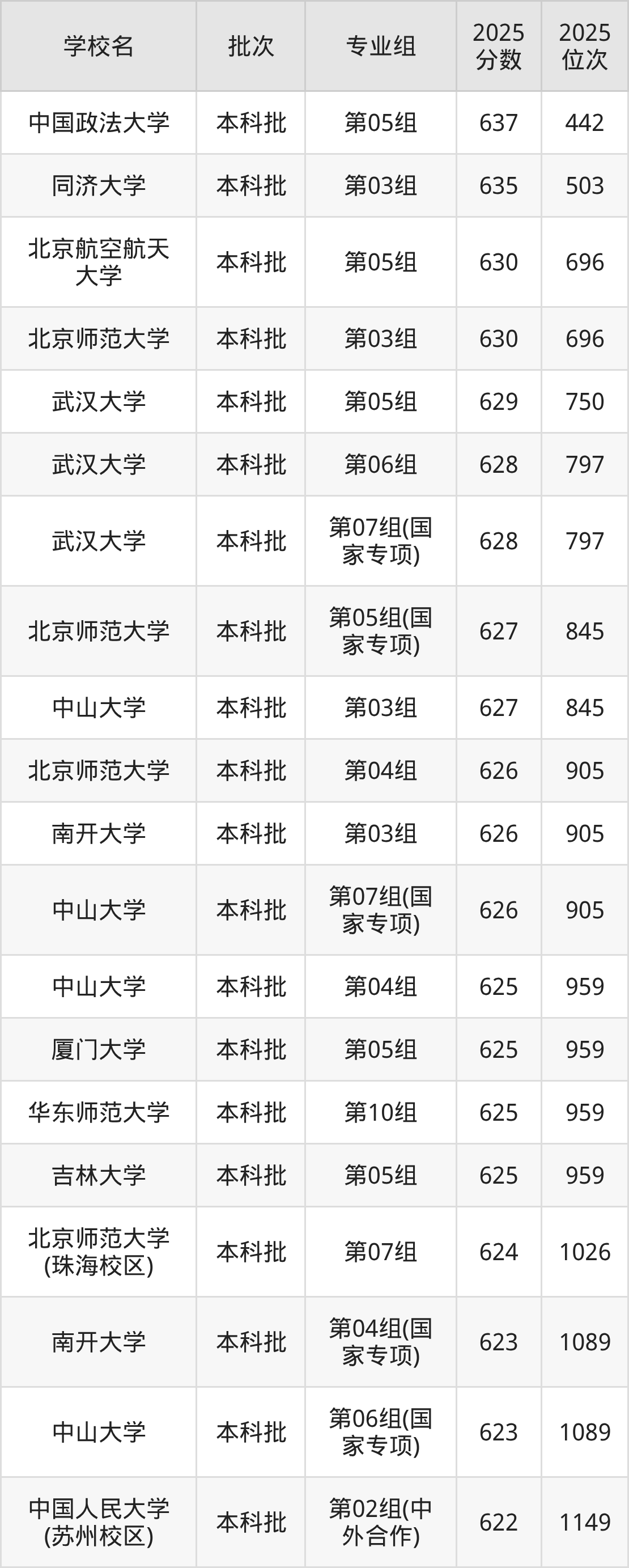2025年湖北高考历史类626分(846名~905名)能上的大学有北京师范大学第04组、南开大学第03组、中山大学第07组(国家专项)。