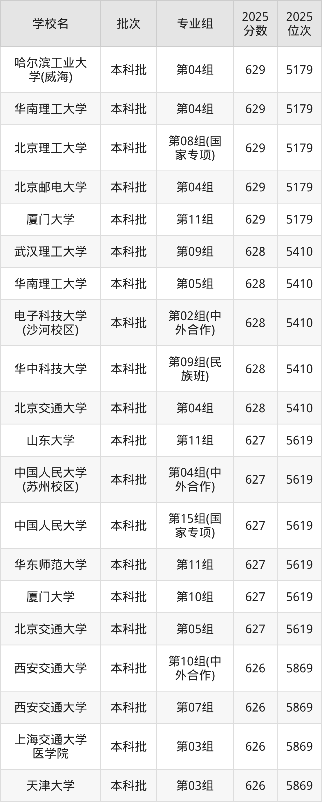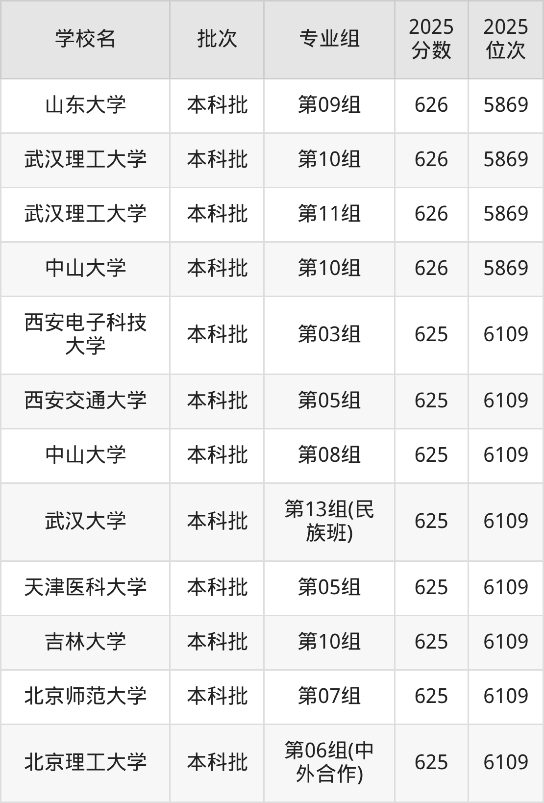 2025年湖北高考物理类626分(5620名~5869名)能上的大学有天津大学第03组、山东大学第09组、武汉理工大学第10组、武汉理工大学第11组等。