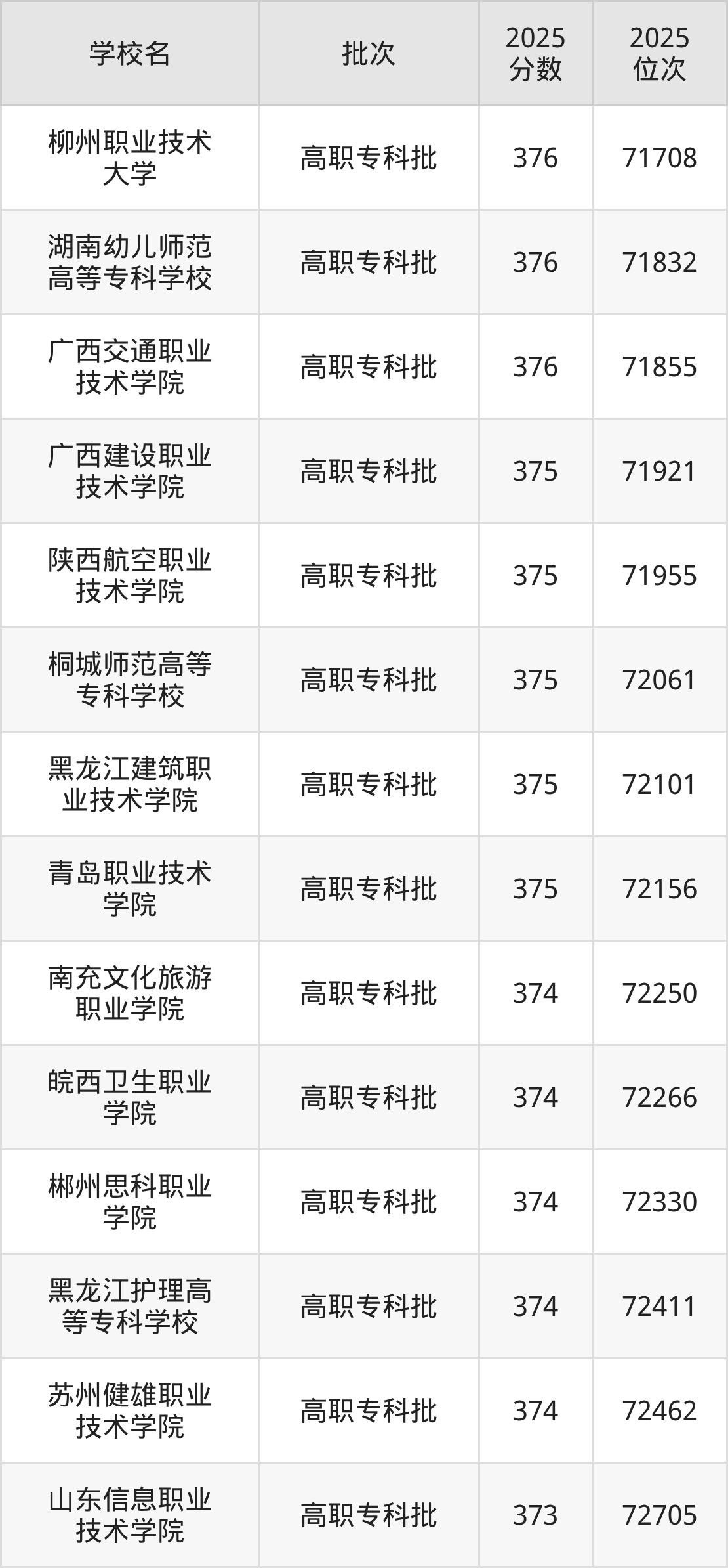 另外录取位次低于该区间(较稳妥)的有山东信息职业技术学院(72705名)、天津机电职业技术学院(73020名)等;录取位次高于该区间(可冲)的有青岛职业技术学院(72156名)、黑龙江建筑职业技术学院(72101名)等。